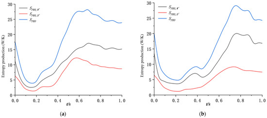 Figure 13a illustrates the variation in entropy production within the pump during unexpected shutdowns under design flow conditions and series-parallel pump configurations. The analysis reveals that the total entropy production shows distinct dynamic patterns corresponding to the four shutdown stages. Initially, as flow rate and rotational speed rapidly decrease, total entropy production plunges to its first trough at 3.92 W/K. With gradual enhancement of reverse flow, total entropy production rises correspondingly, climbing to 8.26 W/K during the braking phase. When reverse rotation commences, the impeller’s rotational speed continues to decline under reverse flow, causing total entropy production to gradually increase to 10.44 W/K. As reverse rotation intensifies further, total entropy production rises again to peak at 28.17 W/K before gradually decreasing, stabilizing after entering the escape phase. Overall, the trends in turbulent dissipation entropy production, wall entropy production, and total entropy production remain consistent. The magnitude and directional fluctuations of flow and velocity, particularly their dramatic variations, dominate entropy production changes. Notably, entropy production fluctuations caused by turbulent dissipation are particularly pronounced, playing a dominant role throughout the process. During the escape phase, turbulent dissipation contributes approximately 63.6% to total entropy production.