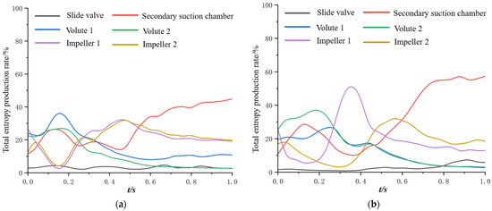 Figure 14a illustrates the variation in total entropy production ratios of major flow components during unexpected shutdowns of series-parallel pumps under design flow conditions. The analysis reveals that the first-stage impeller passage exhibits both higher absolute entropy production values and greater fluctuation amplitudes during shutdowns caused by four operational phases. This trend closely mirrors the overall entropy production changes within the pump, indicating it serves as the primary energy loss source during downtime. This phenomenon primarily stems from unstable flow patterns such as vortices, separation, and recirculation within the first-stage impeller passage, coupled with frequent velocity gradient variations. In contrast, the secondary suction chamber demonstrates significant phase-specific fluctuations: its entropy production ratio rapidly increases upon entering reversal mode and stabilizes after transitioning to fugitive operation. Other components like the secondary impeller, slide valve, and primary-stage volute show relatively minor entropy production variations. Following this pattern, the secondary suction chamber emerges as the component with the highest entropy production at 47.56% after entering fugitive operation, followed by the secondary impeller, primary-stage impeller, and slide valve, while the primary-stage volute exhibits the lowest entropy production ratio.