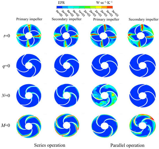 During the unexpected shutdown of the series–parallel pumps in parallel operation, the results show that at the initial moment (t = 0), entropy production covers a large portion of all impeller stages, with substantial losses concentrated near the blade pressure surfaces at the outlet—regions prone to flow separation. As the rotational speed and flow rate decrease, the entropy-production region gradually expands and becomes more pronounced when the flow reaches zero (q = 0), indicating reduced flow stability and increased energy dissipation despite only slight changes in magnitude. When the system enters reverse-flow conditions (N = 0), both the intensity and coverage of entropy production increase sharply, spreading across almost the entire flow passage. A prominent high-entropy zone develops in the central region of the impeller passage, indicating severe hydraulic losses. Finally, as the rotational speed reaches zero (M = 0), abrupt changes in the internal flow cause further energy loss. High-entropy regions extend from the central passage toward the outlet, forming a band-like distribution along the blade pressure surfaces. Although the overall coverage is slightly smaller than at q = 0, the local intensity continues to increase.