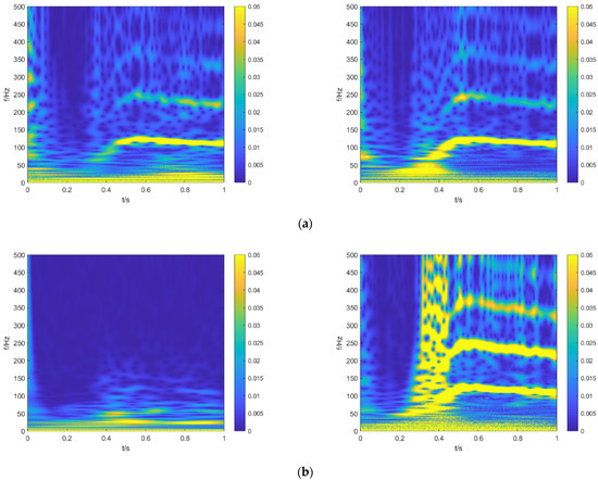 Time-frequency characteristics of pressure pulsation in the primary and secondary impellers under parallel working conditions. (a) Series operation; (b) Parallel operation.