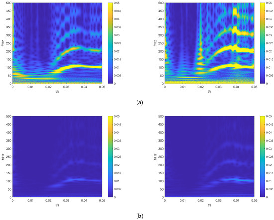Figure 19 presents the time–frequency characteristics of pressure pulsation in the first-stage impeller of the series–parallel pump during an unexpected shutdown under parallel operation. The results indicate that the pressure fluctuation signals at both the inlet and outlet monitoring points of the first-stage impeller also exhibit pronounced energy concentrations at the blade-passing frequency (100 Hz) and its harmonics, reflecting typical rotational periodicity. However, compared with the series operation, the overall energy level of the secondary impeller is significantly lower, showing only weak energy responses at the blade-passing frequency and its harmonics, along with a marked attenuation of high-frequency components. This difference is mainly attributed to the reduced flow rate assigned to the secondary impeller and the weaker flow field interaction during parallel operation, which substantially diminishes the fluid excitation experienced by the secondary impeller during shutdown, resulting in an overall decrease in pulsation energy intensity.