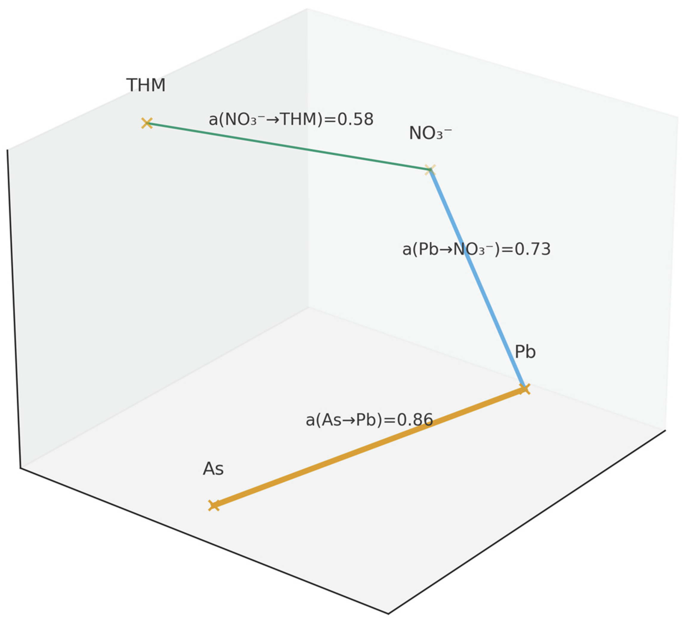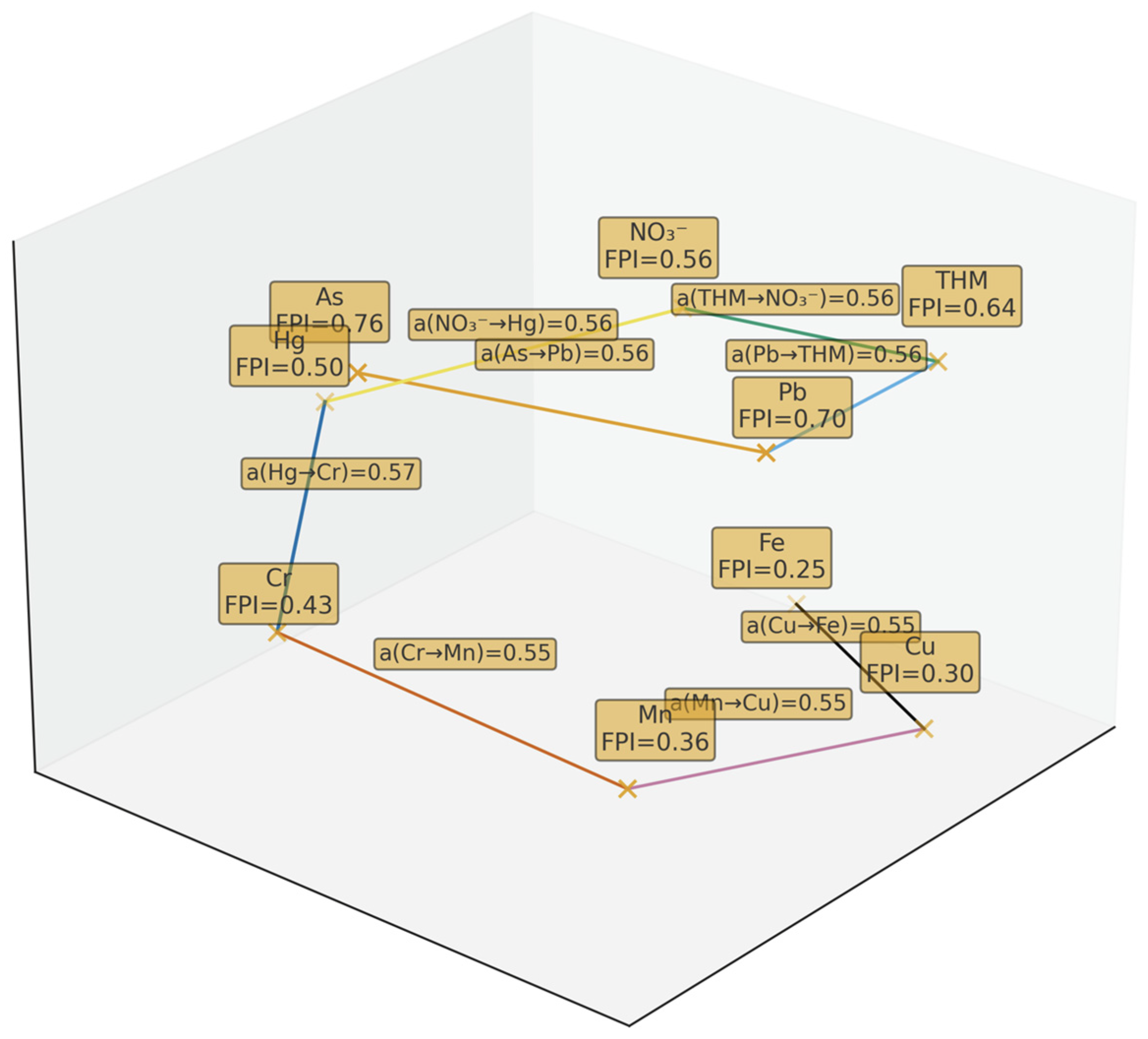 - The nodes (crosses with labels) are water quality parameters arranged in descending order according to FPI (from highest priority to lowest).
