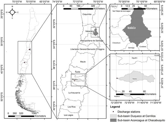 Geographical location of the Aconcagua and Duqueco catchments under study in central Chile.