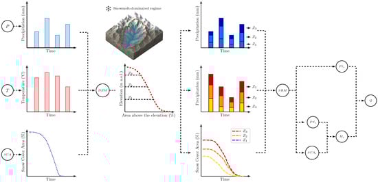 Conceptual diagram of the SRM model, where P is precipitation, T is temperature, is snow cover area, DEM is the digital elevation model, and , , represent elevation-based zones. is solid precipitation by zone, is liquid precipitation by zone, is snow cover area by zone, is snowmelt by zone, and Q is the simulated streamflow.