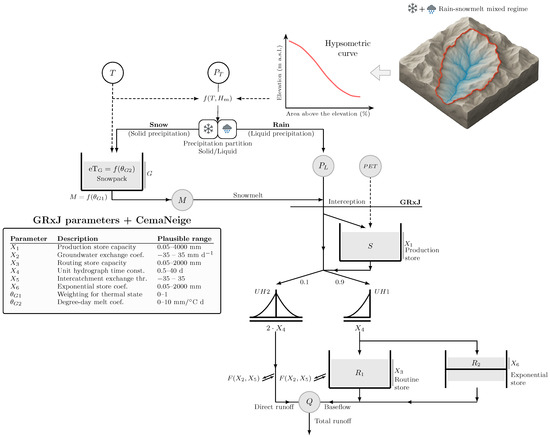 In parallel, Pushpalatha et al. [25] introduced the GR6J model, a six-parameter lumped conceptual model for daily rainfall-runoff simulation, designed to improve low-flow performance relative to GR4J and GR5J. The later integration of the CemaNeige module enabled an explicit representation of snow accumulation and melt, enhancing the applicability of the model in snow-dominated basins [26]. These models have been successfully validated across more than 380 catchments with varying climatic and altitudinal characteristics [27].