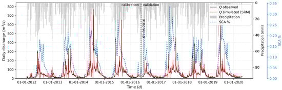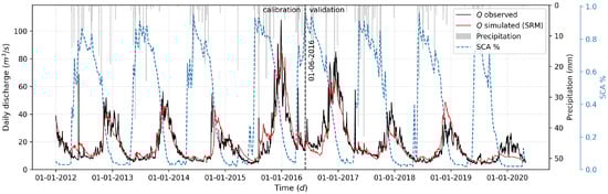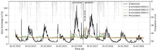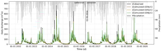 The calibration and validation of the hydrological models were carried out by comparing observed streamflow with the streamflow simulated by each model. The calibration period spanned from 1 January 2012, to 31 May 2016, while the validation period extended from 1 June 2016, to 29 April 2020. These periods were selected to include four complete hydrological cycles for both calibration and validation. The Nash-Sutcliffe Efficiency () was used as the objective function [48].