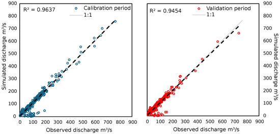Figure 6 and Figure 7 demonstrate a high-quality simulation, with the model successfully reproducing both the general behavior and the variability of streamflow, including extreme events. During both the calibration and validation periods, the model performance is notable. However, abrupt drops in simulated streamflow compared to the observed values are evident in certain instances. This behavior is more clearly seen in Figure 7, where some points are distinctly clustered relative to the 1:1 line.