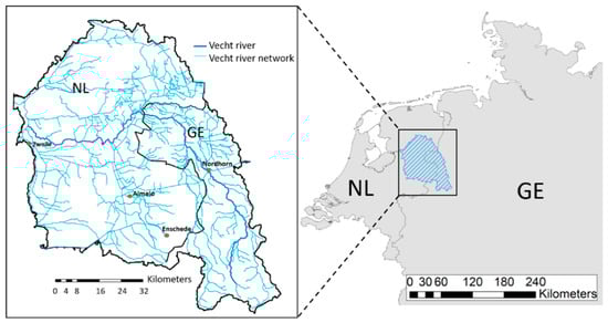 Study area with the water basin of the German-Dutch Vecht. Reproduced with permission via email on 11 June 2025 from Lara Wöhler [], published under a CC BY 4.0 license: https://creativecommons.org/licenses/by/4.0/.