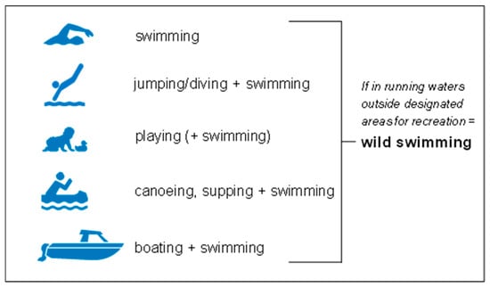 Wild swimming is an internationally used term for year-round swimming in more or less natural waters, and is also called outdoor, open water or natural water swimming. Several categories of recreational activities with varying degrees of water contact were distinguished: swimming, jumping, playing, and canoeing, stand-up paddling, and boating when combined with swimming (Figure 2). All these activities, when carried out in flowing water outside official bathing areas, were referred to here as wild swimming. Water recreation is a more general term that includes all formal and informal leisure activities that occur in aquatic environments. This includes activities that do not involve direct contact with the water, such as boating, kayaking, and fishing.