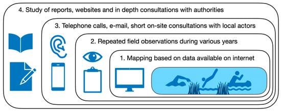 To validate the observations several survey methods were applied (method triangulation, Figure 3). Firstly, to determine which of the waters in the basin were used for wild swimming, old and current swimming sites were mapped using Google, Google Maps and social media. Search terms used were (in Dutch and German): swimming/cooling/recreation in canal/river/stream, open/outdoor/nature/surface water, accompanied by names of local water bodies, villages, cities and the region (Twente/Overijssel). If more than one recent visual evidence (photo or video) was found, or in addition to one visual evidence also a comment that bathing was still a habit at the location, the location was mapped.