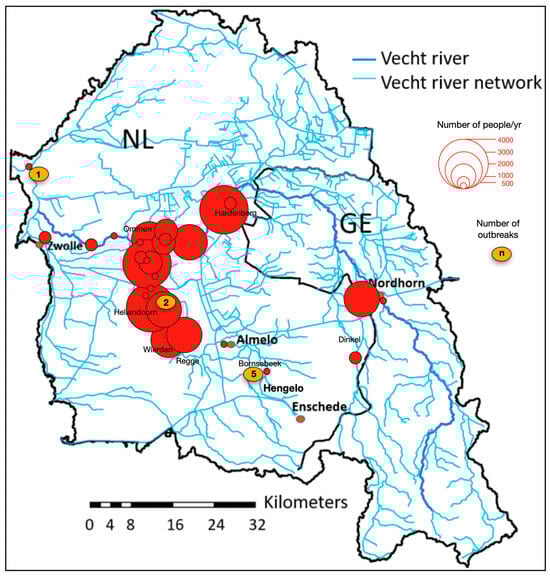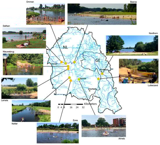 Swimming in surface water not designated as bathing water (wild swimming) has been practiced in Europe for a long time and, in recent decades, mainly by trained adults in competition []. Wild swimming by families and groups of adolescents and children is a phenomenon that seems to have increased in recent years [,]. This growth in popularity has been driven by several factors, including the occurrence of hot summers and the organization of mass sporting events for people of all ages []. The practice of wild swimming is considered beneficial to people’s physical and mental well-being [,,]. It also serves to connect people with the region’s landscape and nature, and it is regarded as a catalyst for regional and local tourism. Nevertheless, this activity poses various health risks, such as hypothermia, ear infections and gastrointestinal infections []. Health risks increase particularly when recreation occurs in waters containing partially treated sewage from sewage treatment plants (STPs) and untreated sewage from sewer overflows, as these waters are contaminated with enteric pathogenic viruses such as hepatitis A, norovirus, rotavirus, adenoviruses and enteric bacteria such as Salmonella spp., Shigella spp., including bacteria carrying genes for multi-drug resistances, such as expanded spectrum beta-lactamases and carbapenemase-producing E. coli [,,]. Large groups of people engaged in recreational activities can become ill or infected with antibiotic-resistant bacteria [,,]. However, there is limited information available regarding the environmental fate and health risks associated with this contamination. It is a task of governments to regulate and monitor official bathing areas. As a result, there is a lack of data on swimming in other types of water. Previous research has focused exclusively on outbreaks associated with sporting events in contaminated surface water [,,]. Therefore, this exploratory case study is the first analysis of informal water recreation in running waters influenced by treated and untreated sewage across an entire river basin. The study area concerns the German-Dutch Vecht(e) river. Due to its cross-border characteristics, relatively compact size, and substantial influence from wastewater treatment facilities, this river basin was selected as a test area for the MEDUWA project. The study discusses the local situation regarding wild swimming, the risk of infection for wild swimmers and the policy implications in terms of toleration of bathing, public information and regular monitoring of pathogens and outbreaks. Finally, an assessment of possible measures was carried out to facilitate policy making and manage the biological risks of wild swimming in general.