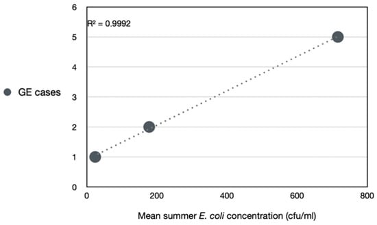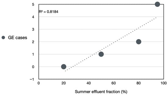 There have been no reports of further spread of infection in the local community. Given the significant number of individuals who engage in recreational activities in surface waters within the designated area, the overall risk of infection appears to be minimal. Nevertheless, under certain circumstances, there is a possibility of elevated risk levels, which could result in outbreaks. Since no stool or other samples were analyzed in the study area, there is no indication of what caused the group infections. Various factors can cause outbreaks, including sick recreationists, food poisoning, pathogens originating from untreated sewage, livestock or wild animals, and pathogens that naturally live in water. According to local water authorities, the risk of infection from wild swimming is often associated with periods of heavy rainfall that result in sewage overflows. However, it has been observed that outbreaks have occurred during both periods of heavy rainfall and drought. It was also notable that the outbreaks were not evenly distributed among the swimming locations. The outbreaks did not occur at the locations most popular with wild swimmers, but were limited to three locations. As illustrated in Figure 5, there have been five outbreaks in Bornsebeek, two outbreaks at the Koemaste location in Midden-Regge and one outbreak in Zwarte Water. These locations had no more than a few hundred wild swimmers per year (Table S1). It therefore seems that local circumstances were at play. All reported activities associated with outbreaks of gastroenteritis included intensive contact with surface water through the combination of playing, jumping, diving and swimming. It is acknowledged that children and adolescents have the potential to ingest elevated quantities of water, thereby increasing the likelihood of exposure to pathogens during recreational activities involving water []. As shown in Table 4, these waters (with the exception of Zwarte Water) were exhibiting STP-effluent fractions ranging from 80 to 95% and E. coli concentrations between 15,000 and 71,500 colony forming units (cfus)/100 mL. The summer E. coli concentration (R2 = 0.9992) and, to a lesser extent, the summer effluent fraction (R2 = 0.8184) predict the likelihood of GE (Figure 6 and Figure 7). This finding suggests that the reported outbreaks were indeed associated with exposure to fecally contaminated water.