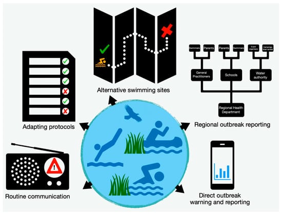 The practice of wild swimming will continue to increase as heat waves become more frequent due to climate change. To manage this activity structurally, it needs to be recognized as an emerging social phenomenon. This means not only addressing the risks associated with water recreation, but also improving the livability of homes, schools, workplaces and creating more green spaces in neighborhoods to help people better adapt to high temperatures. However, it is foreseeable that many people will defy warnings and restrictions and seek to cool off in nearby waters, often unaware of the risks involved. The resulting outbreaks of infection have a disruptive effect on society, affecting groups such as schoolchildren, residents or staff of different institutions at the same time. In addition, these outbreaks can have a significant economic impact on businesses in the tourism and leisure sectors. The occurrence of infections also serves as a warning sign of other potential risks, such as the presence of antimicrobial-resistant microorganisms and hazardous chemicals like human and veterinary pharmaceuticals in the water [,]. The introduction of effective risk management procedures in relation to water recreation complements the European Union’s efforts to achieve good chemical and biological status of surface waters, including Germany [] and the Netherlands []. These goals, complicated by climate change [], can only be achieved if all stakeholders are willing to collaborate. This requires promoting synergies between different efforts and ensuring effective communication and cooperation, including at transboundary level.