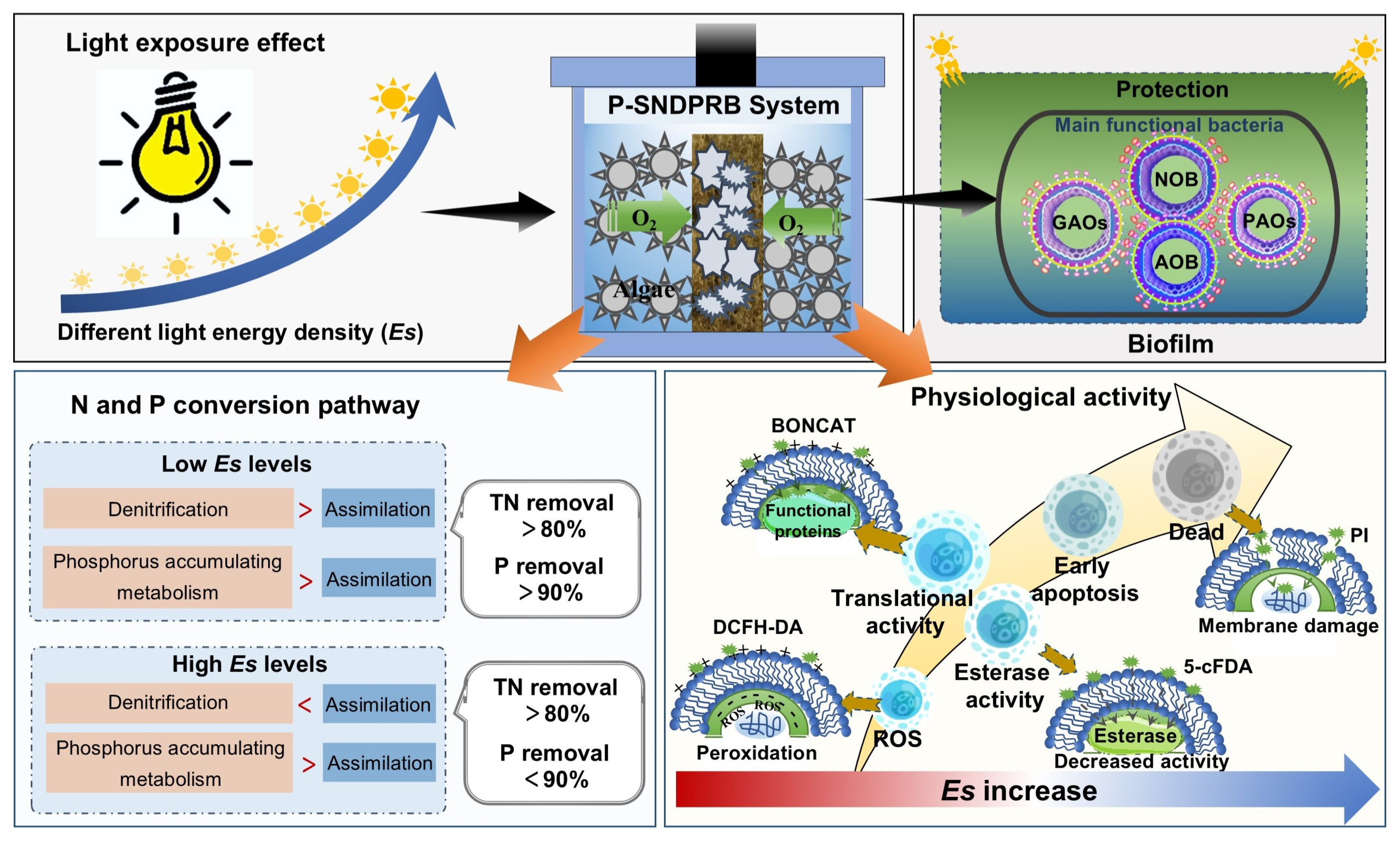 3.5. Effect of Light Energy Density on Microbial Vitality and Population Distribution of P-SNDPRB Systems