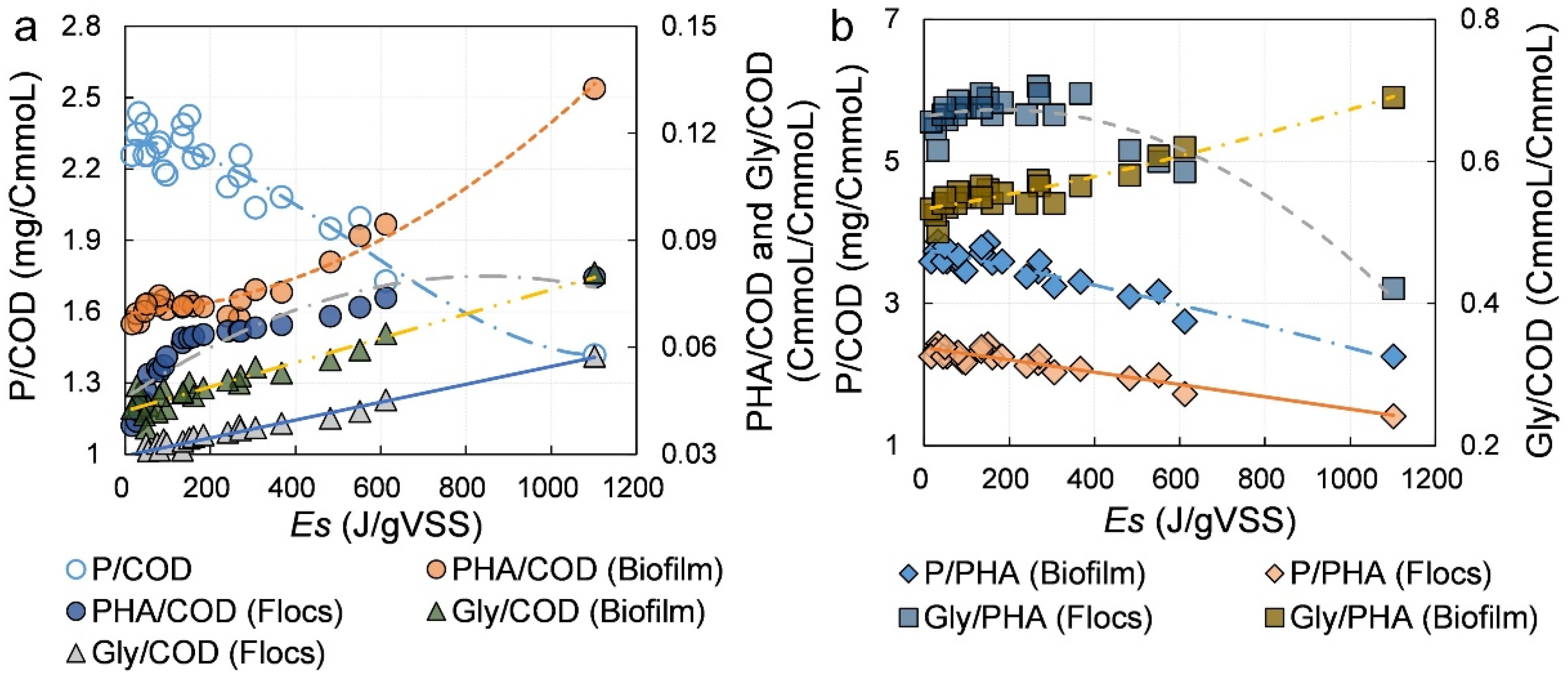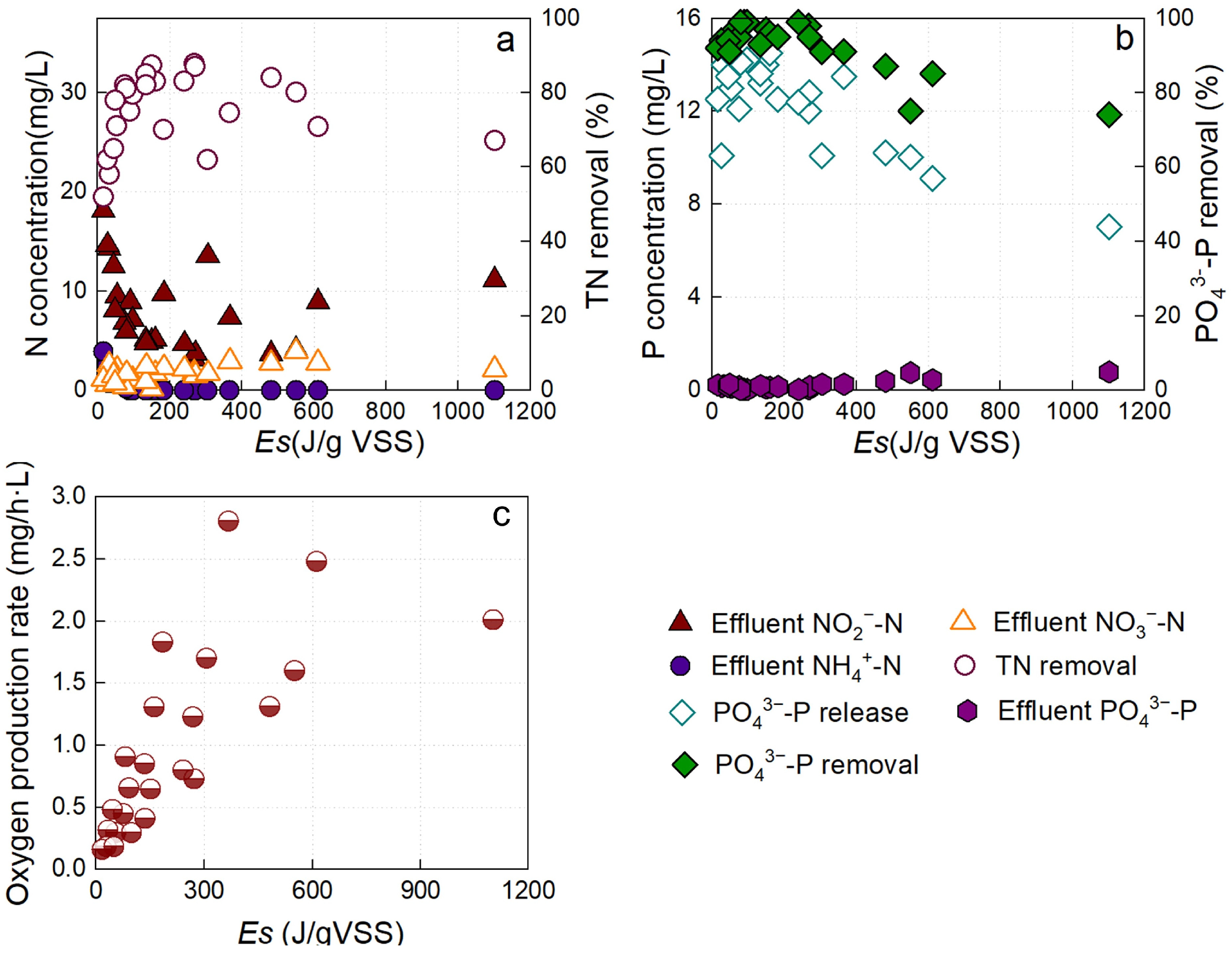 | Test | Light Intensity (W/m2) | Light Exposure Time (h) | MLSS (g/L) | Es (J/gVSS) |
