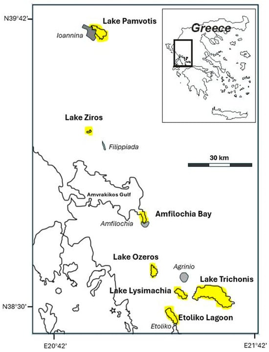 The present study was conducted in five natural lakes and two coastal lagoons situated in western Greece (Figure 1). These areas have differences concerning their morphometric, trophic, and socioeconomic characteristics, as well as the main human activities (Table 1). Lake Trichonis is the largest natural lake in Greece. It is a deep and warm monomictic lake, and previous studies have classified it as oligotrophic to mesotrophic [15]. There are various surface water supplies (e.g., seasonal streams), as well as groundwater inflows (approx. 30% of the total annual water inflows), which provide an adequate quantity of water and result in a positive water balance [16]. In the surrounding area, there are 23 villages, having an overall population of about 20,000 residents, with most of them occupied with agriculture. The lake has been included in the Natura 2000 network of protected areas. Additionally, it is very rich in fish species, of which, the most economically important is Atherina boyeri Risso, 1810, exploited by professional fishing.