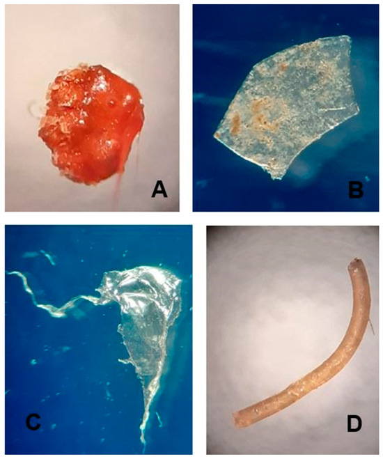 Due to the difficulty of discriminating the transparent plastic fibers from other fiber-like organic material, needles with curved tips were used to exercise pressure in the middle of the fiber, expecting a permanent deformation in the pressing spot. In cases of doubt for some fragments, a needle with candescent tip was used to perform a melting test; particles that melted when heated by touching were considered microplastics [22]. The above tests were used to identify the synthetic nature of the particles, which were then measured and counted. The microscopic identification procedures were performed by only one investigator. When aggregates of fibers or overlapping fibers were found, there was an effort to disentangle them by moving them to a separate Petri dish. The minimum measurable dimensions reached 0.1 mm, which was the detection limit. The investigation of fragments revealed four different morphotypes, as follows (Figure 2). (1) ‘hard rounded’: fragments having irregular rounded shapes, with smooth or rough surfaces (Figure 2A). (2) ‘hard flattened’: fragments having flat and hard surfaces with their thickness being proportionally too small (Figure 2B). (3) ‘soft flattened’: fragments having flat but soft surfaces with their thickness being proportionally too small (Figure 2C). (4) ‘cable-like’: fragments having cable-like shapes with much greater length than width, with soft or hard surfaces being either smooth or rough (Figure 2D).