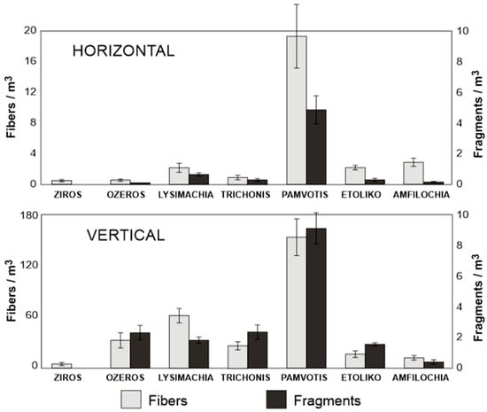 The respective values for the fragments were 2.33 ± 1.06 n/m3 in Lake Ozeros and 9.17 ± 2.70 n/m3 in Lake Pamvotis (Figure 3). The abundance ratio of fibers/fragments was greater in the vertical than in the horizontal samples in all the studied areas. Specifically, the ratio of fibers/fragments in the horizontal samples fluctuated between 3.4 (Lake Lysimachia) and 17.6 (Amfilochia Bay) with an average value of 7.3 (standard error = ±2.1), in comparison to the vertical samples, where the ratio fluctuated between 8.8 (Etoliko Lagoon) and 31.4 (Lysimachia Lake) with an average value of 16.5 ± 3.0.