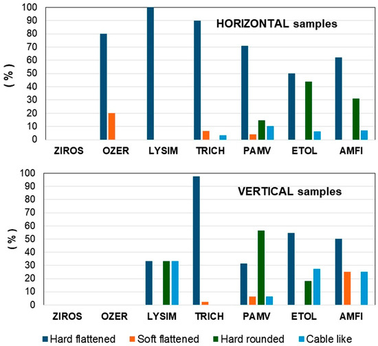 The microplastic fragments recovered from the samples varied also in their shape, grouped by four distinct morphotypes (Figure 7). Most of them had the ‘hard flattened’ morphotype (71.5% and 75.0% in the horizontal and vertical samples, respectively), followed by the ‘hard rounded’ morphotype (11.8% and 15.2%), the ‘cable-like’ morphotype (9.3% and 8.8%), and the ‘soft flattened’ morphotype, which accounted for 3.5% and 4.4%, respectively. In the case of the horizontal samples, the ‘hard flattened’ morphotype prevailed in all ecosystems, while it was the only fragment type in Lake Lysimachia. However, in the vertical samples, the ‘hard rounded’ morphotype prevailed in Lake Pamvotis (50.0%) and presented equal proportions with the ‘hard flattened’ and the ‘cable-like’ morphotypes in Lake Lysimachia (Figure 7).