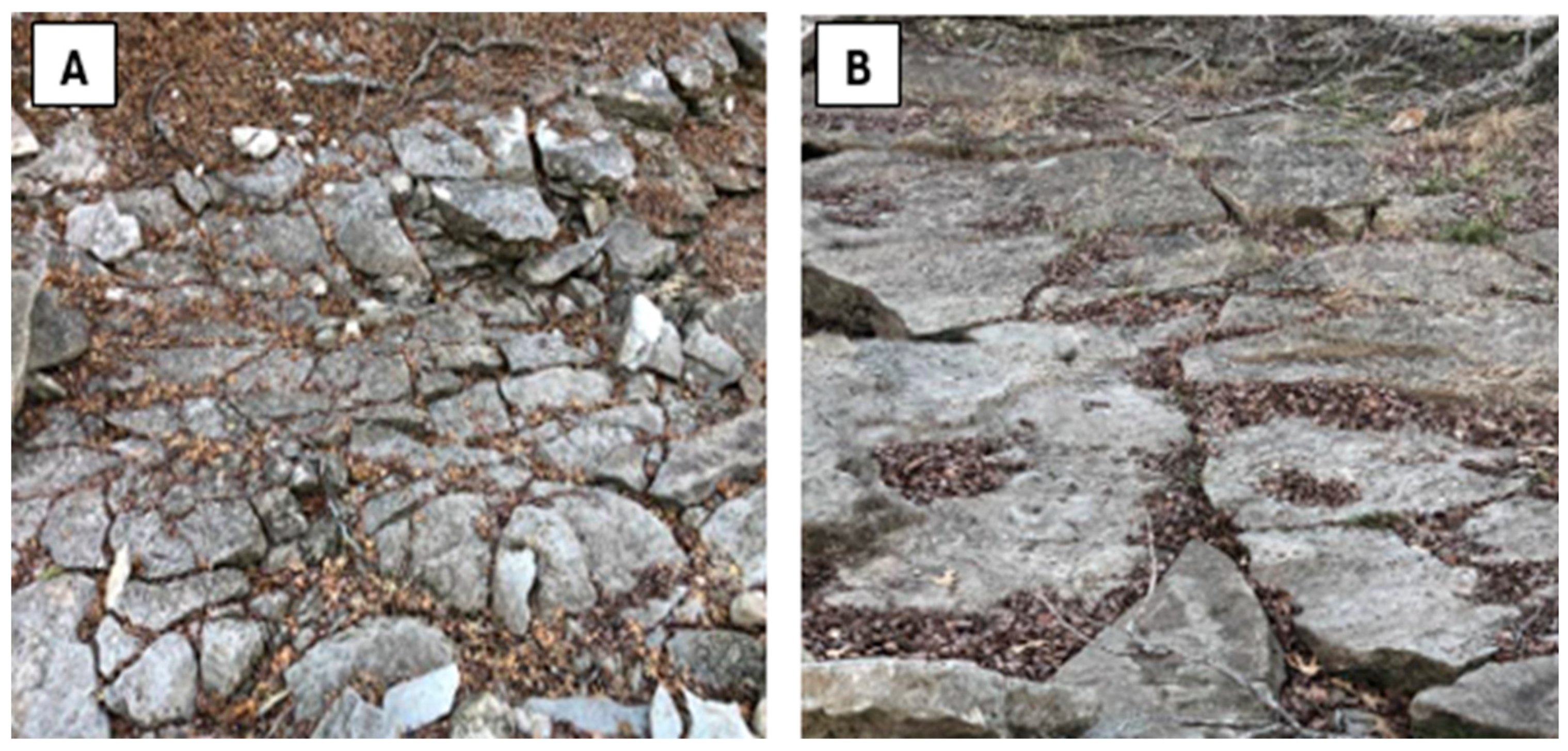 | Fracture (F2) | Edwards | N60E | <0.10 | Clustered fractures filled with leaves, sticks, loose or soft mud |