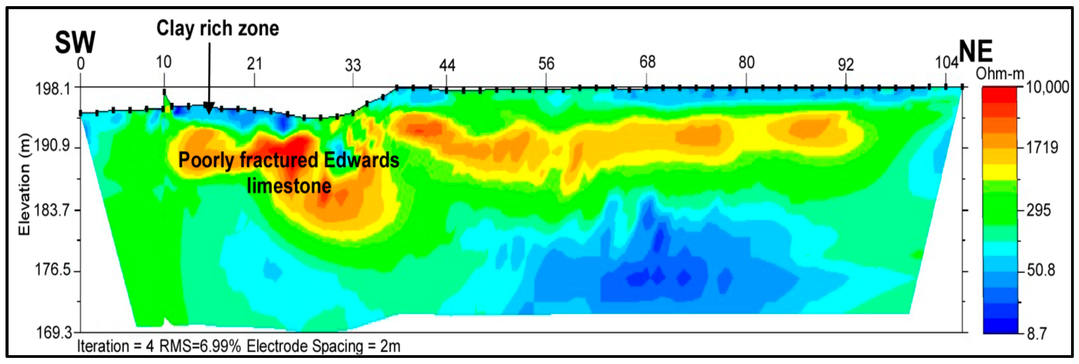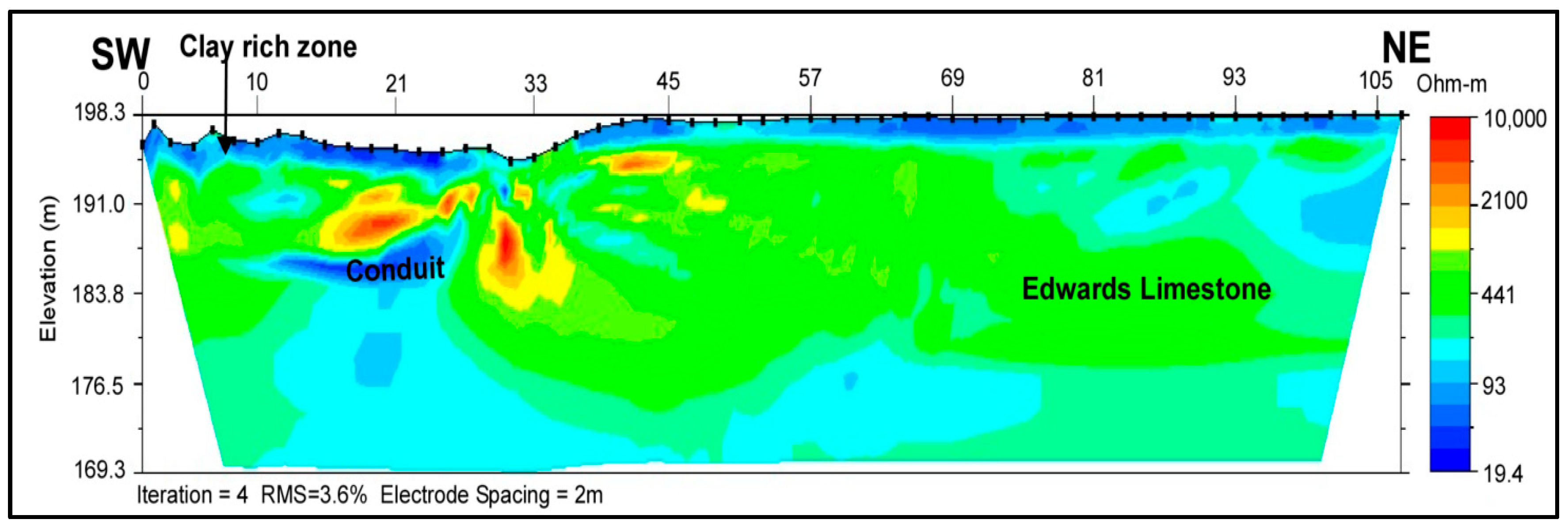 - Gary, M.O.; Rucker, D.F.; Smith, B.D.; Smith, D.V.; Befus, K. Geophysical Investigations of the Edwards-Trinity Aquifer System at Mul tiple Scales: Interpreting Airborne and Direct-Current Resistivity in Karst. In Proceedings of the 13th Sinkhole Conference NCKRI Symposium 2, Carlsbad, New Mexico, 6–10 May 2013; pp. 195–206. [Google Scholar]