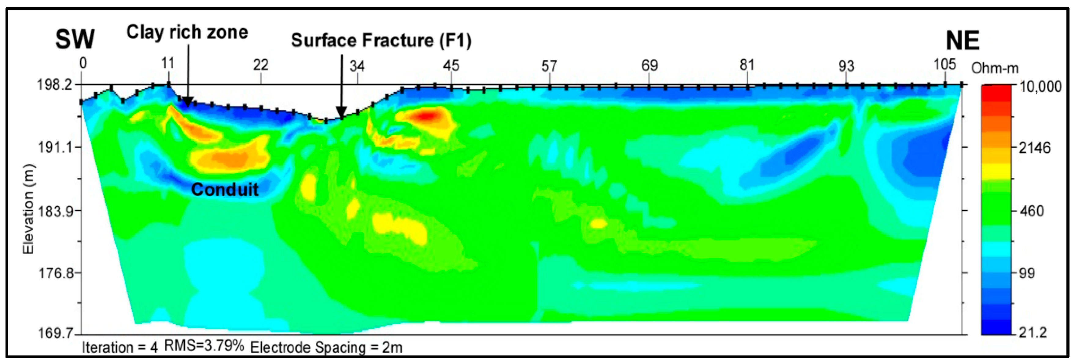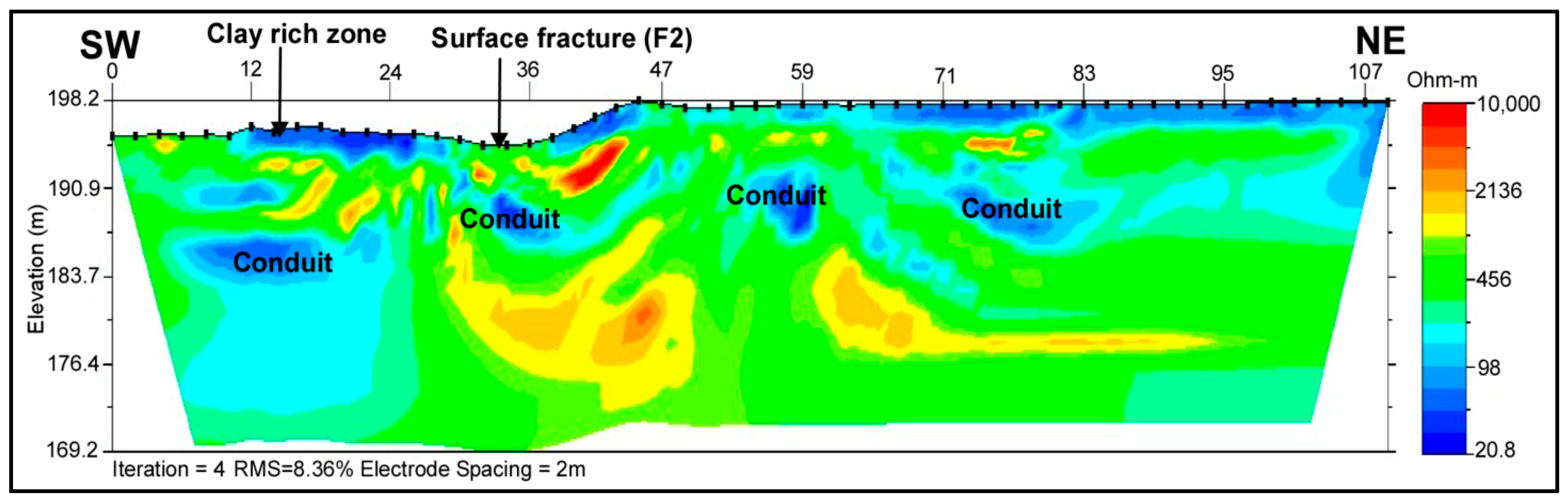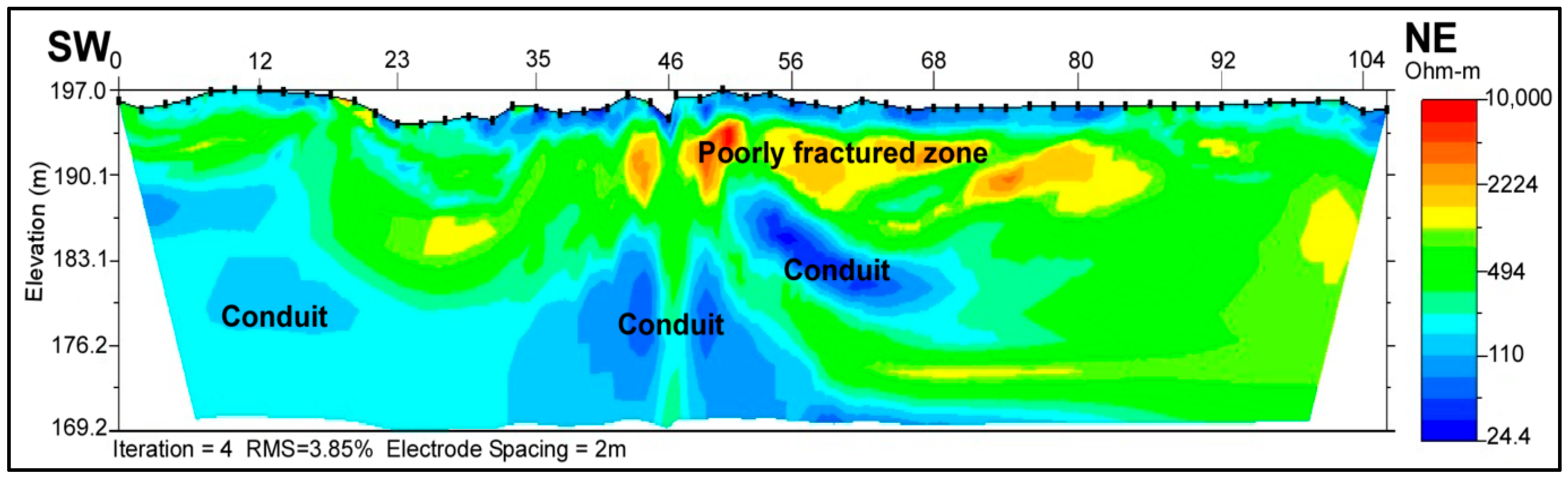 - Zhu, J.; Currens, J.C.; Dinger, J.S. Challenges of using electrical resistivity method to locate karst conduits-A field case in the Inner Bluegrass Region, Kentucky. J. Appl. Geophys. 2011, 75, 523–530. [Google Scholar] [CrossRef]