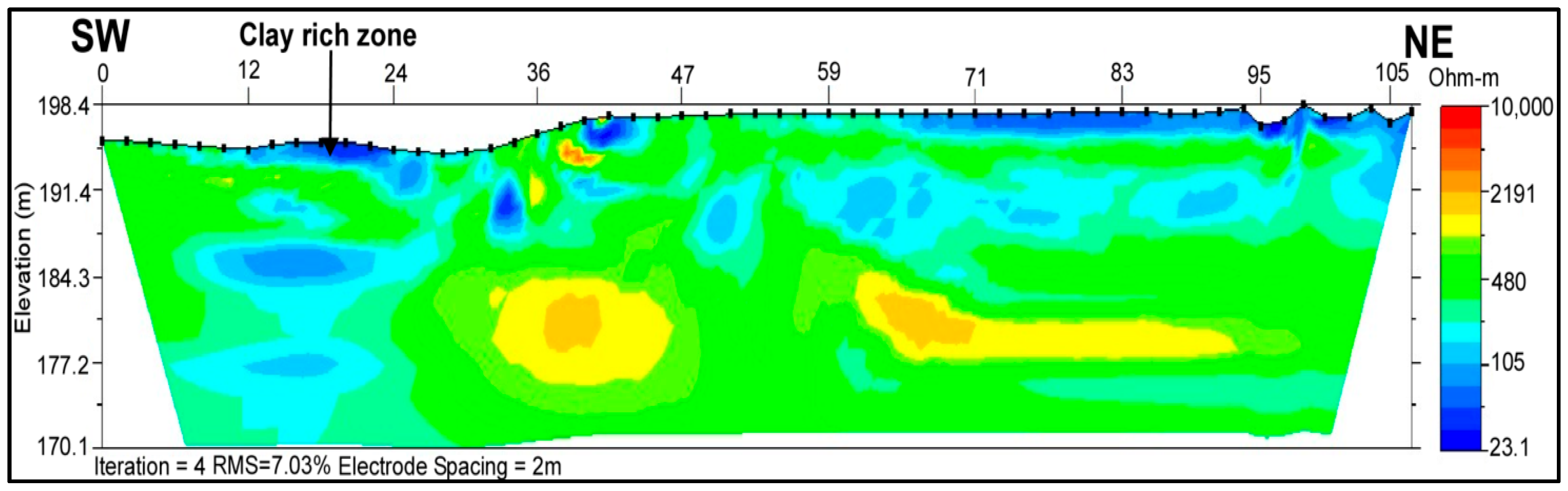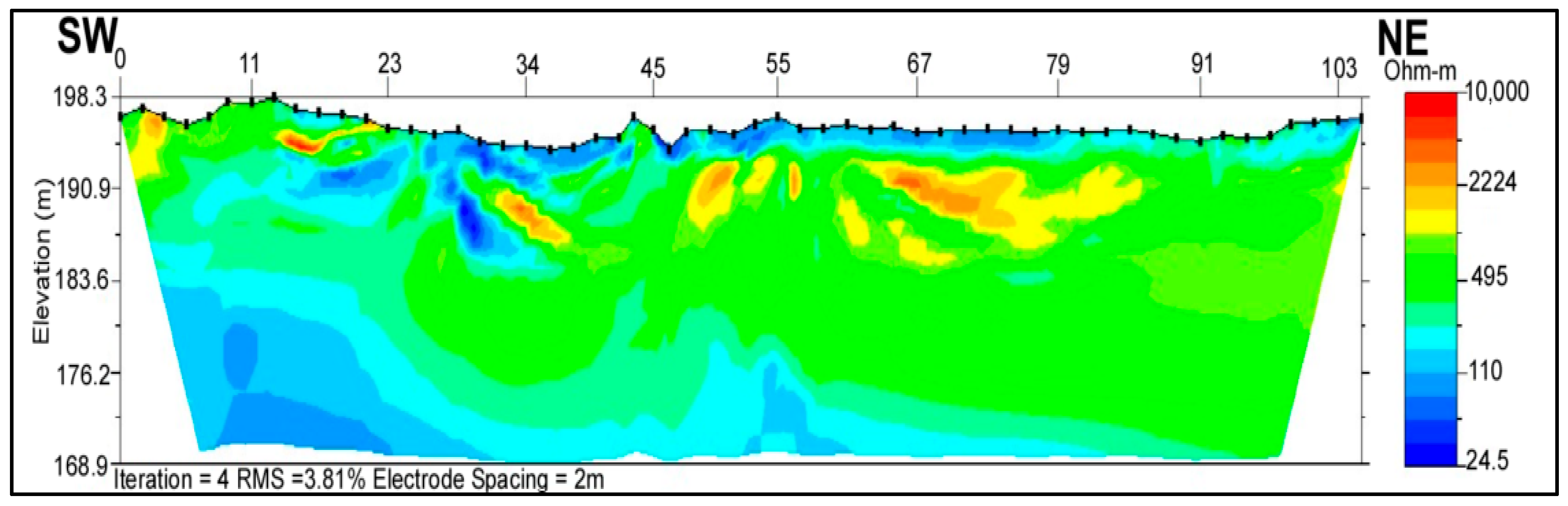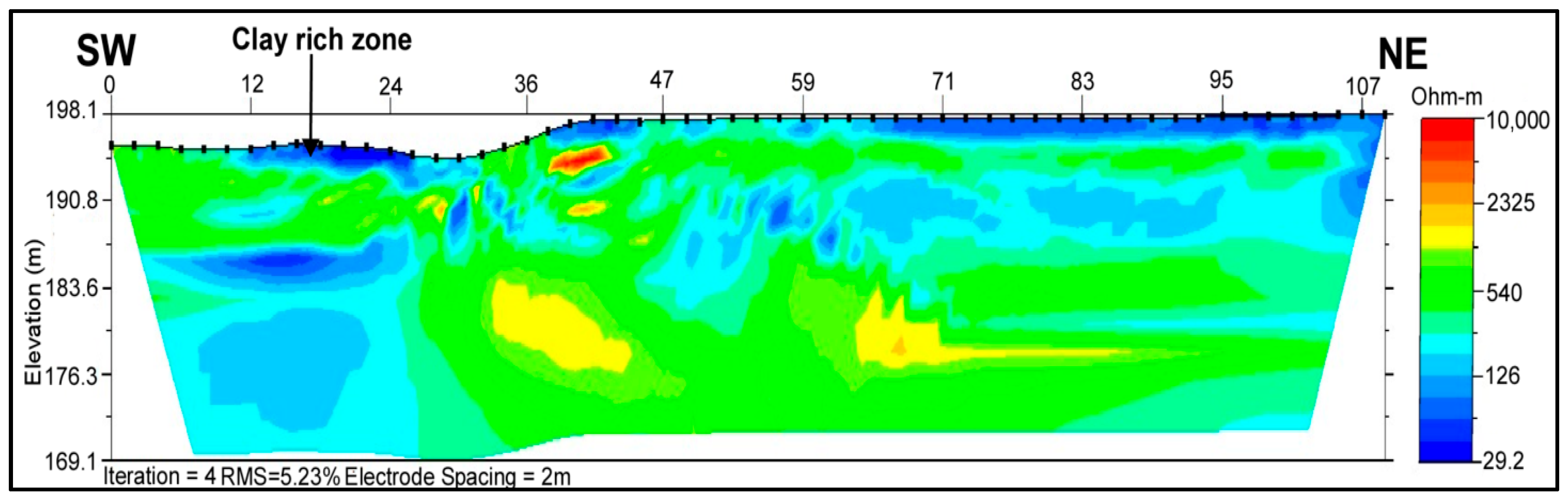 - Redhaounia, B.; Ilondo, B.O.; Gabtni, H.; Sami, K.; Bédir, M. Electrical Resistivity Tomography (ERT) applied to Karst carbonate aquifers: Case study from Amdoun, northwestern Tunisia. Pure Appl. Geophys. 2016, 173, 1289–1303. [Google Scholar] [CrossRef]