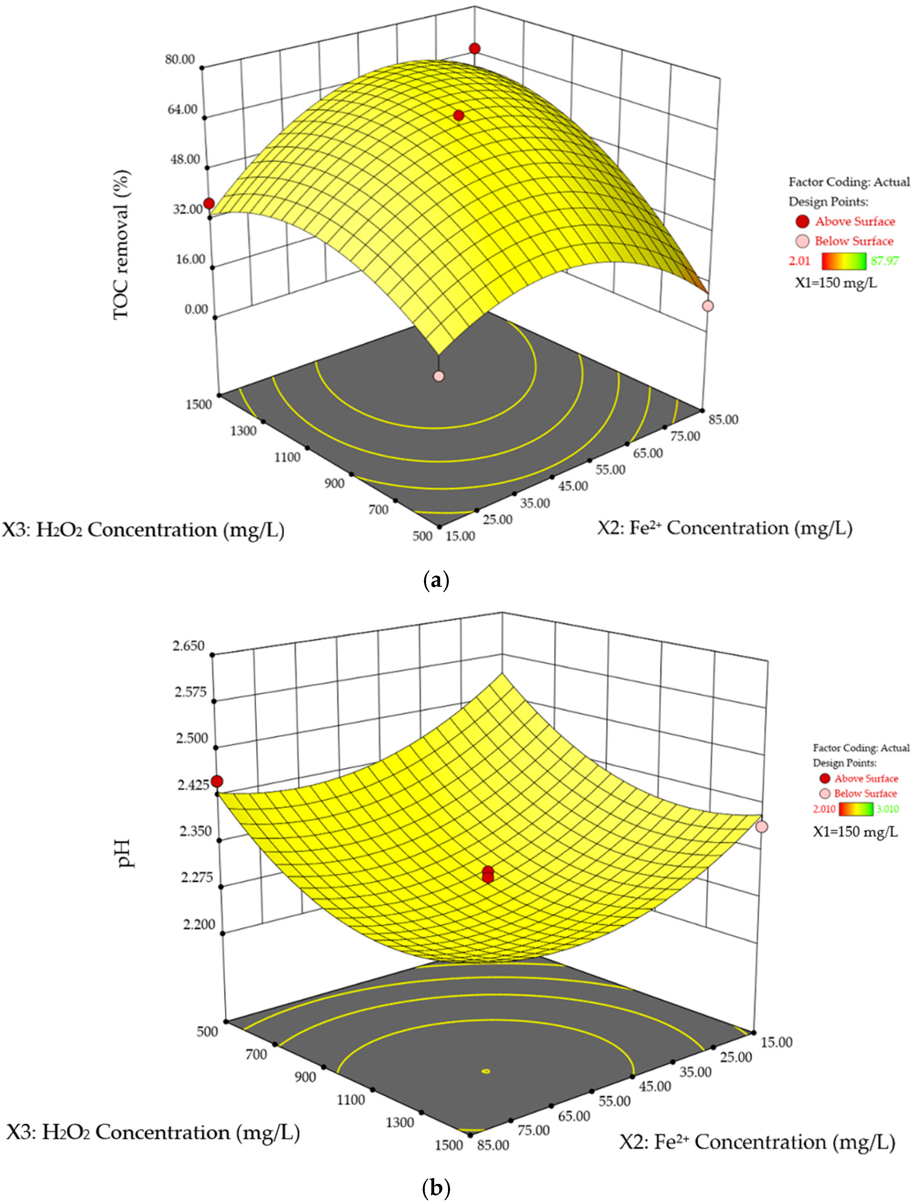 3.2. Interactive Effects of Fe2+ and H2O2 on %TOC Removal and pHFinal
