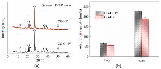 Figure 1 presents the XRD spectra and adsorption capacities of the modified CG samples. In Figure 1a, it can be observed that NaP zeolite was formed after calcination and hydrothermal treatment. NaP zeolite could also be synthesized when the raw CG underwent only hydrothermal treatment; however, the diffraction intensity was notably lower. Figure 1b shows that CG-C-HY exhibited better adsorption performance than CG-HY, though the difference between the two was relatively modest, with qe,Cd and qe,Pb values of approximately 10 and 40 mg/g, respectively. Based on these results, the high-energy-consuming calcination process was excluded from the hydrothermal modification of CG samples. No CG samples underwent high-temperature calcination prior to the hydrothermal modification process described in the following sections.