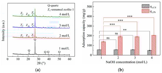 The impact of NaOH concentration on both the crystalline phase evolution and the adsorption performance of the modified CG is presented in Figure 2. As shown in Figure 2a, the XRD pattern of the sample treated with 1 mol/L NaOH is predominantly characterized by quartz. This indicates that the alkalinity at this level was inadequate to sufficiently dissolve the Si and Al components in CG for zeolite crystallization. In contrast, with the NaOH concentration elevated to 2 mol/L and beyond, a distinct zeolite phase identified as Na8(Al6Si6O24)(NO2)2·3H2O (labeled Z1) emerges. The diffraction peaks for this phase intensify with further increases in NaOH concentration. Correspondingly, Figure 2b demonstrates a consistent enhancement in qe,Pb with rising NaOH concentration. This trend is closely linked to the increased yield of the zeolite phase and the consequent creation of more active adsorption sites. Statistical analysis revealed that NaOH concentration had a significant effect on qe,Pb. In contrast, a NaOH concentration of up to 4 mol/L was required to exert a significant effect on qe,Cd.