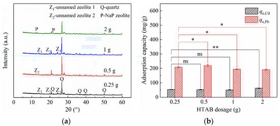 Figure 3 shows the influence of HTAB dosage on the characteristics of the modified CG products. As shown in Figure 3a, the formation of two distinct zeolitic phases, denoted as Z1 and Z2, was observed within the HTAB dosage range of 0.25 to 1 g. These phases were identified as Na8(Al6Si6O24)(NO2)2∙3H2O and K5Ca2(Al9Si23O64)∙24H2O, respectively. NaP zeolite was identified when 2 g of HTAB was used. HTAB is commonly employed as a modifier for coal-based solid wastes in previous studies. It is hypothesized that HTAB functions as an organic template, promoting the formation of crystalline NaP zeolite. Figure 3b shows that, with increasing HTAB dosage, qe,Pb initially increased and then decreased, reaching a maximum value of 213.4 mg/g at 0.5 g. In contrast, qe,Cd exhibited a peak value of 62.4 mg/g at 2 g. The observed disparity in adsorption performance may be attributed to distinct removal mechanisms for Cd2+ and Pb2+. Specifically, the formation of NaP zeolite during modification primarily enhances Cd2+ uptake, while the treatment with 0.5 g of HTAB favors the adsorption of Pb2+. Statistical analysis indicated that a HTAB dosage of 2 g was required to significantly affect qe,Cd, implying that enhancing qe,Cd may necessitate an increase in HTAB usage. Furthermore, HTAB dosage exhibited a moderate yet discernible influence on qe,Pb across the investigated range.