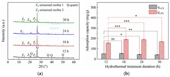Figure 4 illustrates the effects of hydrothermal treatment duration on the XRD pattern and adsorption capacity of the modified CG samples. As shown in Figure 4a, a zeolite material Na8(Al6Si6O24)(NO2)2∙3H2O (denoted as Z1) is formed after 12 h of hydrothermal treatment, with diffraction intensity increasing as the treatment duration is extended. This is because a longer processing time facilitates the polymerization of silicate and aluminate ions, promoting the formation of zeolite with higher crystallinity. However, a different zeolite phase K5Ca2(Al9Si23O64)∙24H2O (denoted as Z2) is identified after 24 h of treatment. This may result from the complex phase transitions occurring during the zeolite formation from coal-based solid wastes. During crystallization, the aluminosilicate gel first gives rise to metastable intermediates, which then gradually transform into more stable crystalline phases over time. At a hydrothermal treatment duration of 18 h, both qe,Cd and qe,Pb reached their maximum values of 55.5 and 191.1 mg/g, respectively. This suggests that excessively long processing times may be detrimental, and an optimal treatment duration is required to achieve the best adsorption performance. Statistical analysis revealed that the duration of hydrothermal treatment influenced both qe,Cd and qe,Pb, with a more pronounced effect on qe,Pb.