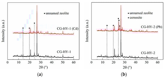 The adsorption capacity results in this study further indicate that the uptake of Pb2+ by hydrothermally modified CG samples is approximately three times higher than that of Cd2+. This difference can be attributed to two main factors. First, a portion of Pb2+ is removed through precipitation. Second, the relative atomic mass of Pb (207.2) is nearly twice that of Cd (112.4), which also contributes to the higher measured adsorption capacity for Pb2+ in mass-based units. Moreover, the hydrated ionic radius of Cd2+ (0.43 nm) is larger than that of Pb2+ (0.40 nm), suggesting that Cd2+ may have limited access to certain exchange sites within the zeolite structure compared to Pb2+. It is therefore inferred that the number of exchangeable sites available for Cd2+ in hydrothermally modified coal gangue is fewer than those for Pb2+.