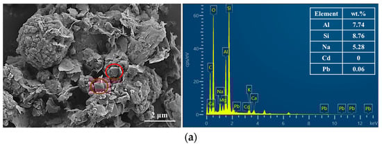 Figure 8 shows the SEM images and EDX spectra of modified CG samples after the adsorption of Cd2+ and Pb2+. The SEM images reveal the presence of aggregated small particles in these samples. Given that the CG samples did not undergo calcination pretreatment, it is hypothesized that the NaOH solution only dissolved a limited amount of Si4+ and Al3+, leading to the formation of crystal nuclei of zeolite materials. As shown in Figure 8a,c, octahedral granules are observed adhering to the surfaces of CG particles, which are inferred to be well-crystallized zeolite structures. However, these granules are no longer visible after the adsorption of Cd2+ and Pb2+ (Figure 8b,d), potentially due to the occupation of zeolite pore channels by Cd2+ and Pb2+ ions, disrupting the crystal lattice structure. The EDX analysis further confirms adsorption, as evidenced by the increase in Cd and Pb content from 0 and 0.07 wt.% to 1.18 wt.% and 1.45 wt.%, respectively. Simultaneously, a reduction in Na content was observed, which is attributed to an ion-exchange mechanism, where Na+ ions in the zeolite framework are replaced by Cd2+ and Pb2+ ions.