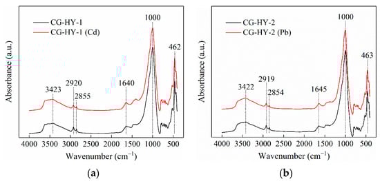FTIR spectra of the hydrothermally modified CG samples before and after adsorption. (a) CG-HY-1. (b) CG-HY-2.