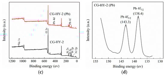 Figure 10 displays the results of XPS analysis conducted on the modified CG samples both before and after the adsorption of Cd2+ and Pb2+ ions. As illustrated in Figure 10a,c, the full spectra confirm that the binding energies of Na 1s, O 1s, Si 2p and Al 2p in CG-HY-1 and CG-HY-2 align well with previously reported values in the literature [6,27]. The adsorption of Cd2+ onto CG-HY-1 is validated by the two newly observed peaks at 404.9 eV and 411.7 eV, corresponding to Cd 3d5/2 and Cd 3d3/2, respectively, as shown in Figure 10b. Likewise, Figure 10d demonstrates the adsorption of Pb2+ onto CG-HY-2, evidenced by peaks at 138.4 eV and 143.3 eV, characteristic of Pb 4f7/2 and Pb 4f5/2, respectively. A marked reduction in the Na 1s peak intensity in CG-HY-2 (Pb) compared to that in CG-HY-2 indicates that ion exchange occurs between Pb2+ and Na+ ions during the adsorption process. These findings from XPS analysis are consistent with those obtained through SEM-EDX.