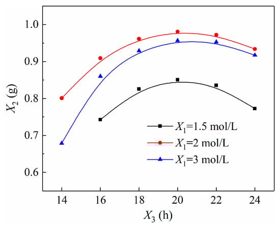 Combined effects of X1 (NaOH concentration), X2 (HTAB dosage) and X3 (Hydrothermal duration) on the adsorption capacity for Cd2+. (a) X1 and X2, X3 = 18 h. (b) X2 and X3, X1 = 2 mol/L. (c) X1 and X3, X2 = 0.625 g.