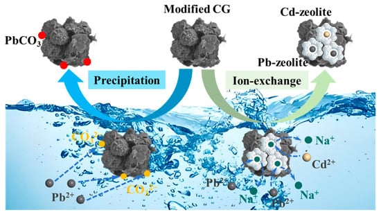 - Hydrothermal modification promoted the formation of zeolite structures in the modified CG, enhancing its adsorption properties. The primary adsorption mechanism for Cd2+ and Pb2+ involved ion exchange, with additional Pb2+ removal attributed to the precipitation of cerussite (PbCO3).