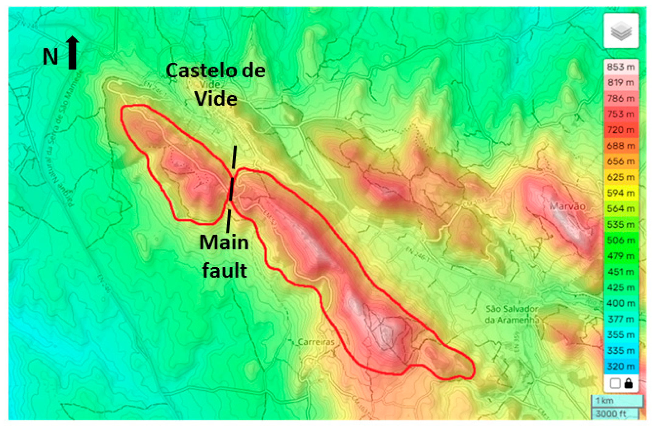 - Fernandes, A.P.; Perdigão, J.C.; Carvalho, H.F.; Peres, A.M. Notícia Explicativa da Folha 28 D–Castelo de Vide, Carta Geológica de Portugal na Escala 1/50,000; Direcção-Geral de Minas e Serviços Geológicos: Lisboa, Portugal, 1973. (In Portuguese) [Google Scholar]