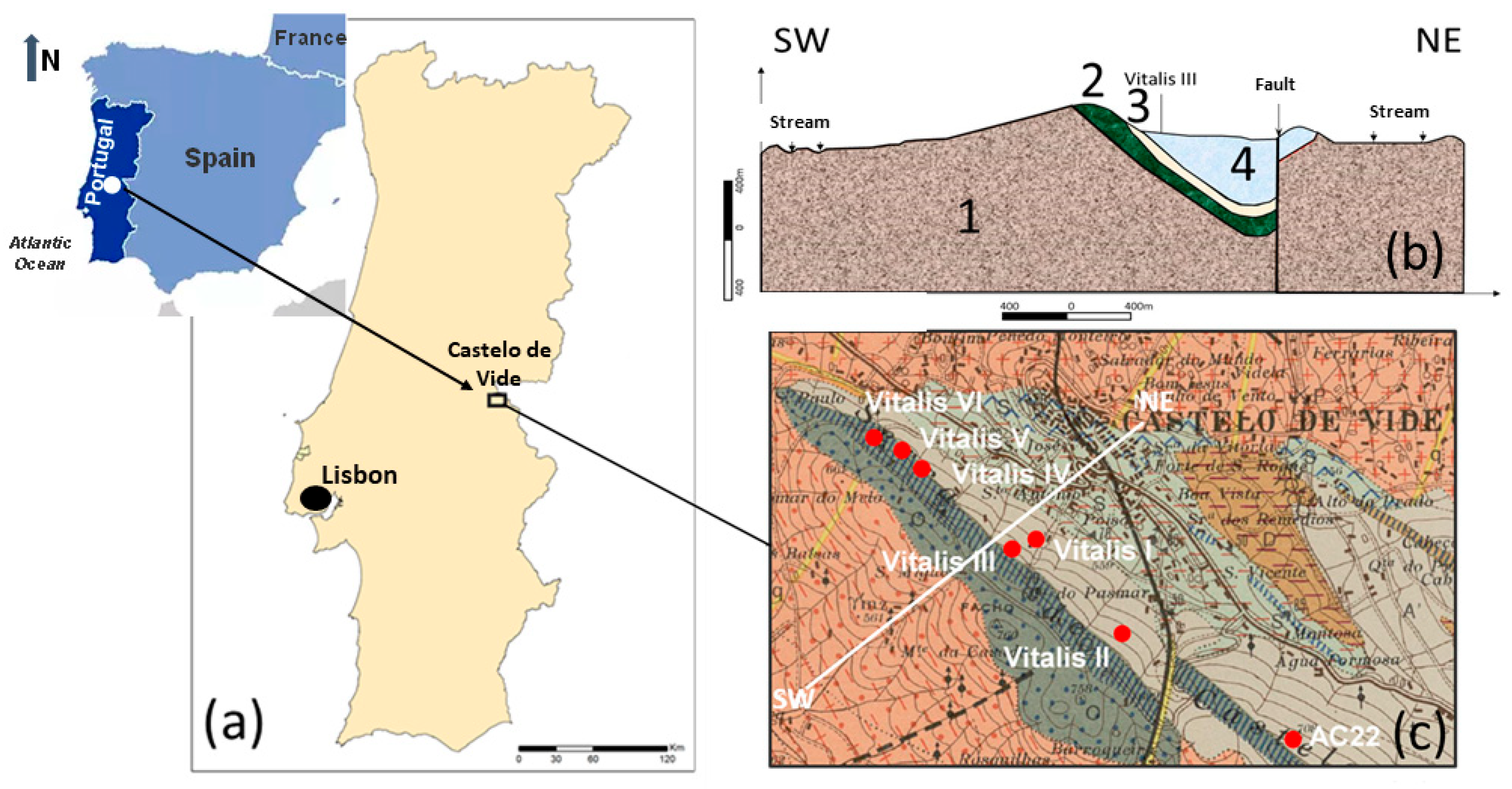 - Morais Almeida, A.; Dias, D.; Almeida, M.; Marques, J.M.; Antunes da Silva, M. Contribuição para o desenvolvimento do modelo conceptual de circulação da Água Mineral Natural de Castelo de Vide. In Proceedings of the Livro de Actas do 12º Seminário sobre Águas Subterrâneas, Coimbra, Portugal, 7–8 March 2019; pp. 18–21. (In Portuguese). [Google Scholar]