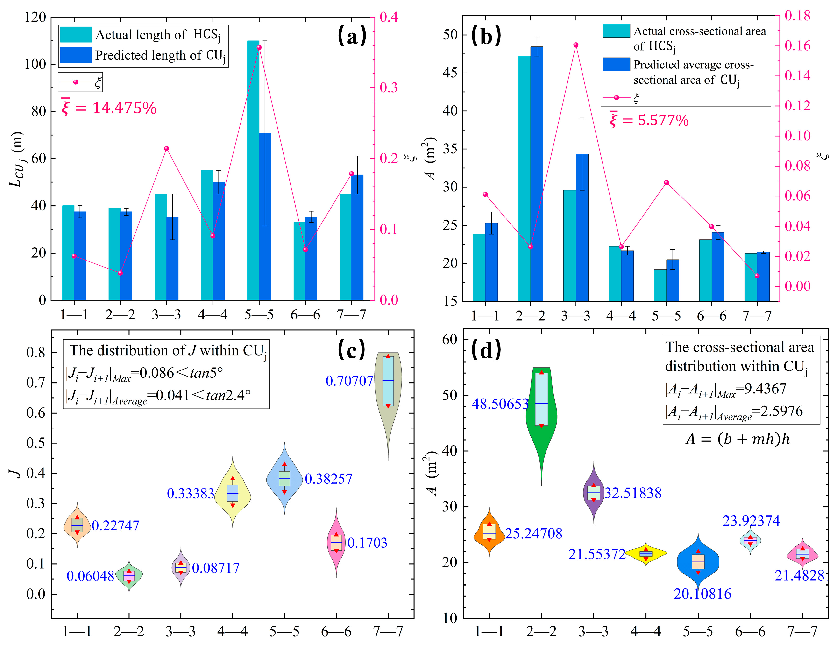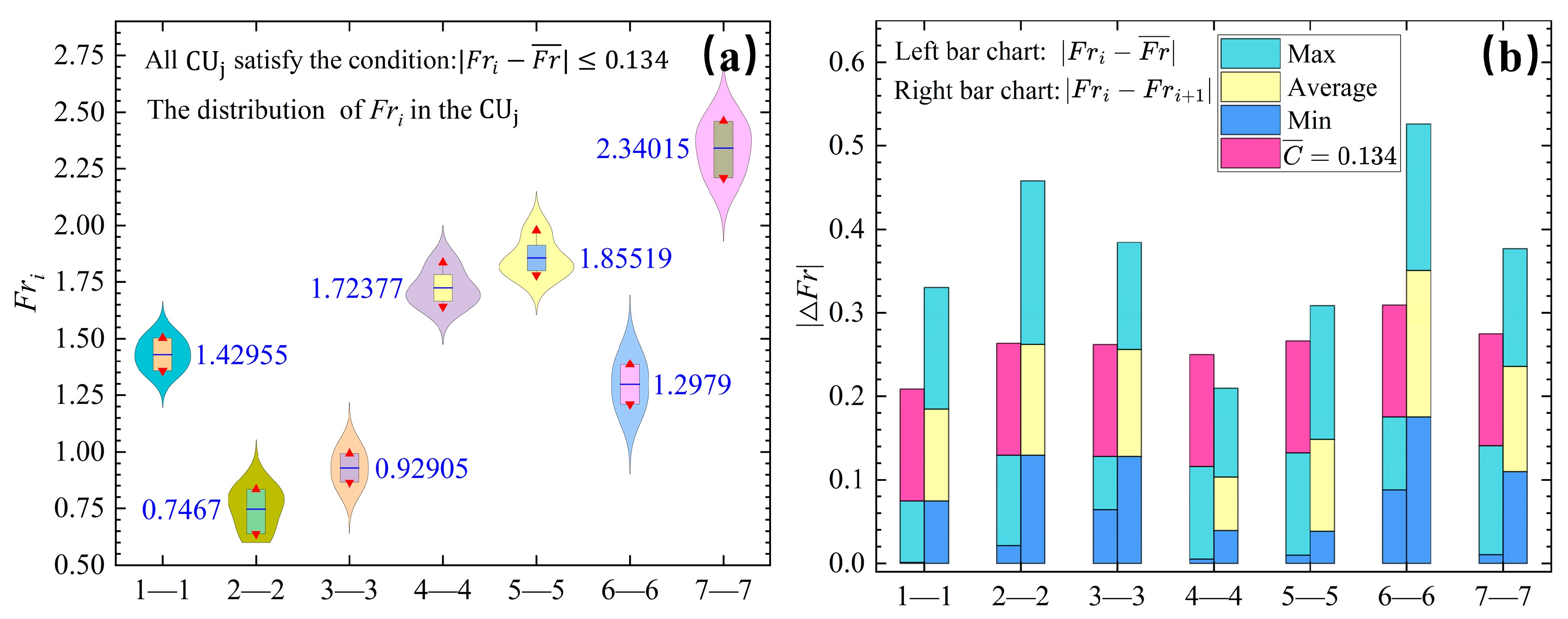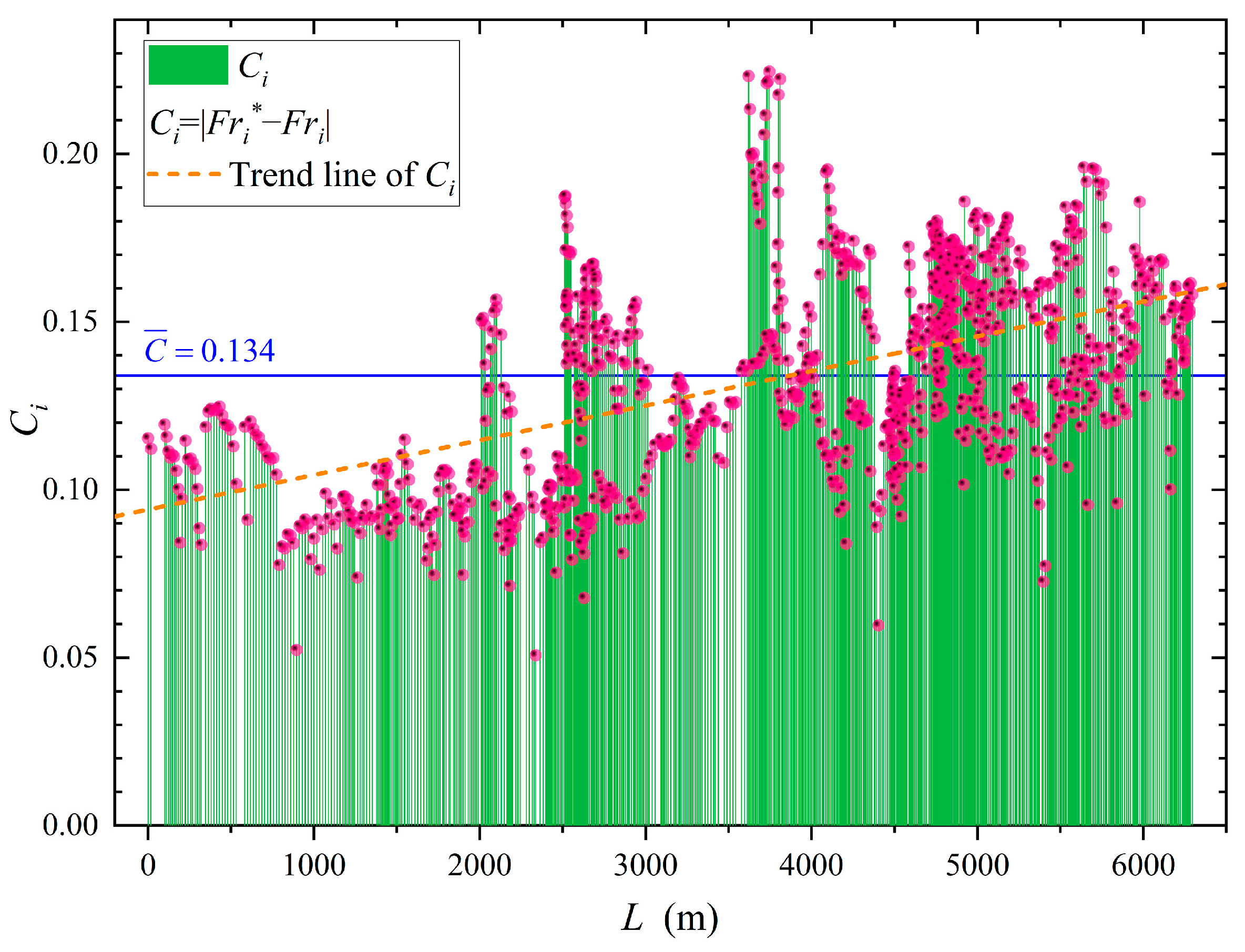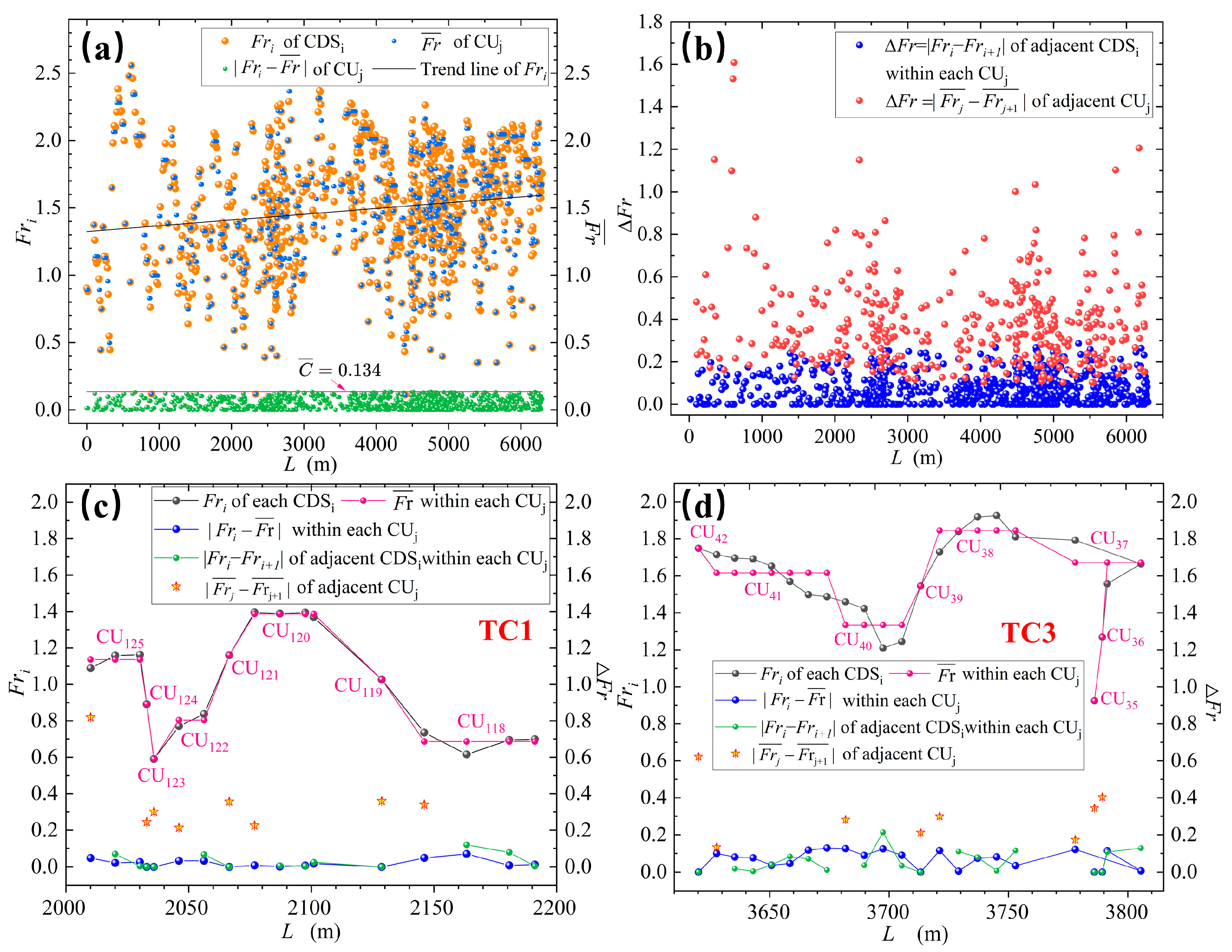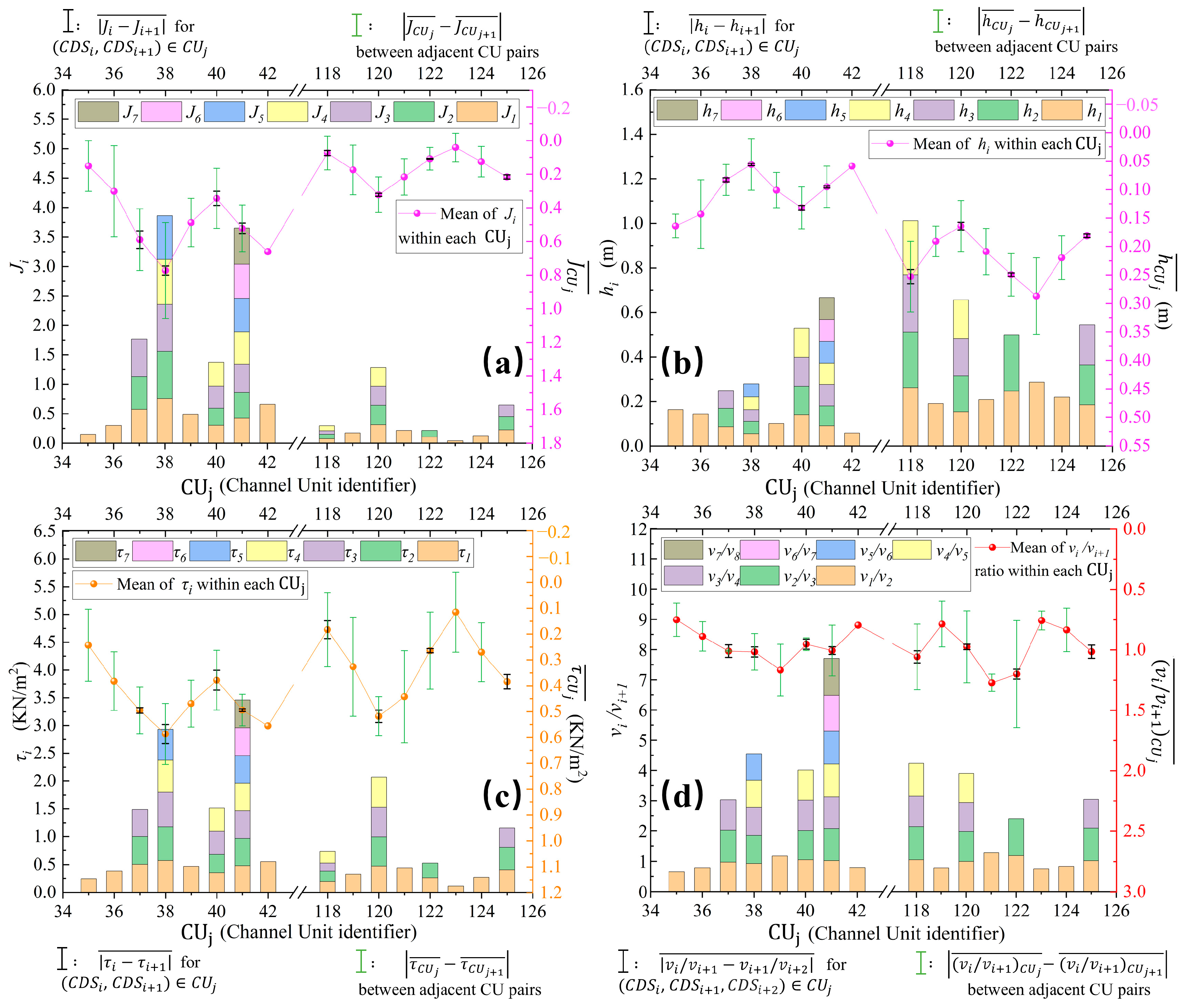 - We construct an computation model constrained by cross-sectional geometry, topographic parameters, and material property coefficients, enabling to jointly characterize the geometric features and hydraulic parameters of channel-discretized segments (). The spatial variability of between adjacent is shown to be controlled primarily by local differences in geometric parameters; statistically, is positively correlated with longitudinal gradient and bed shear stress, and negatively correlated with cross-sectional area. Using the critical bed-shear stress for incipient motion at the solid–liquid cutoff grain size together with a small velocity-perturbation analysis, we determine a physical identification threshold. Constraining the absolute deviation of within each by this threshold yields an automated, physics-based framework for delineating homogeneous , ensuring the physical self-consistency and transferability of the units.