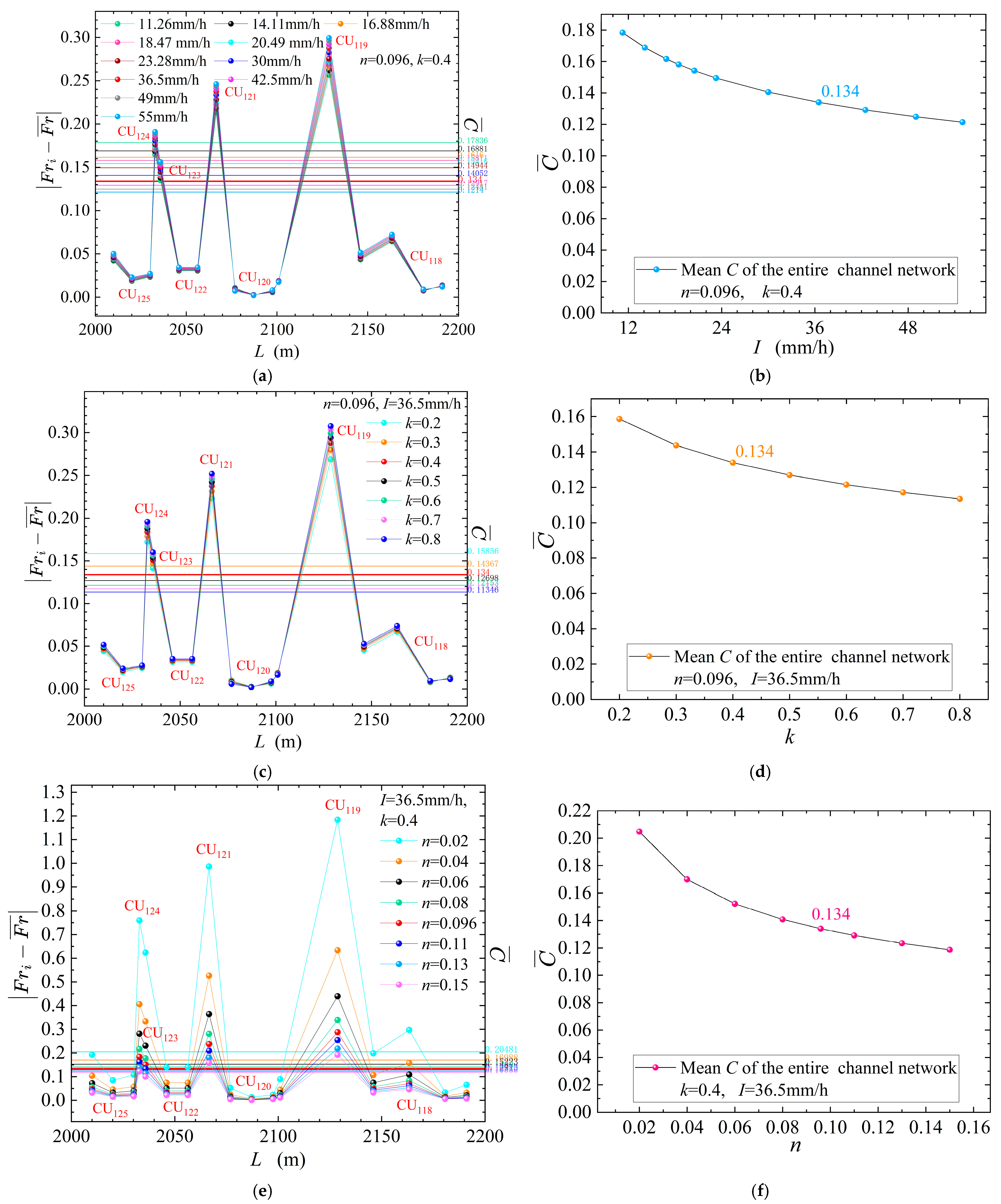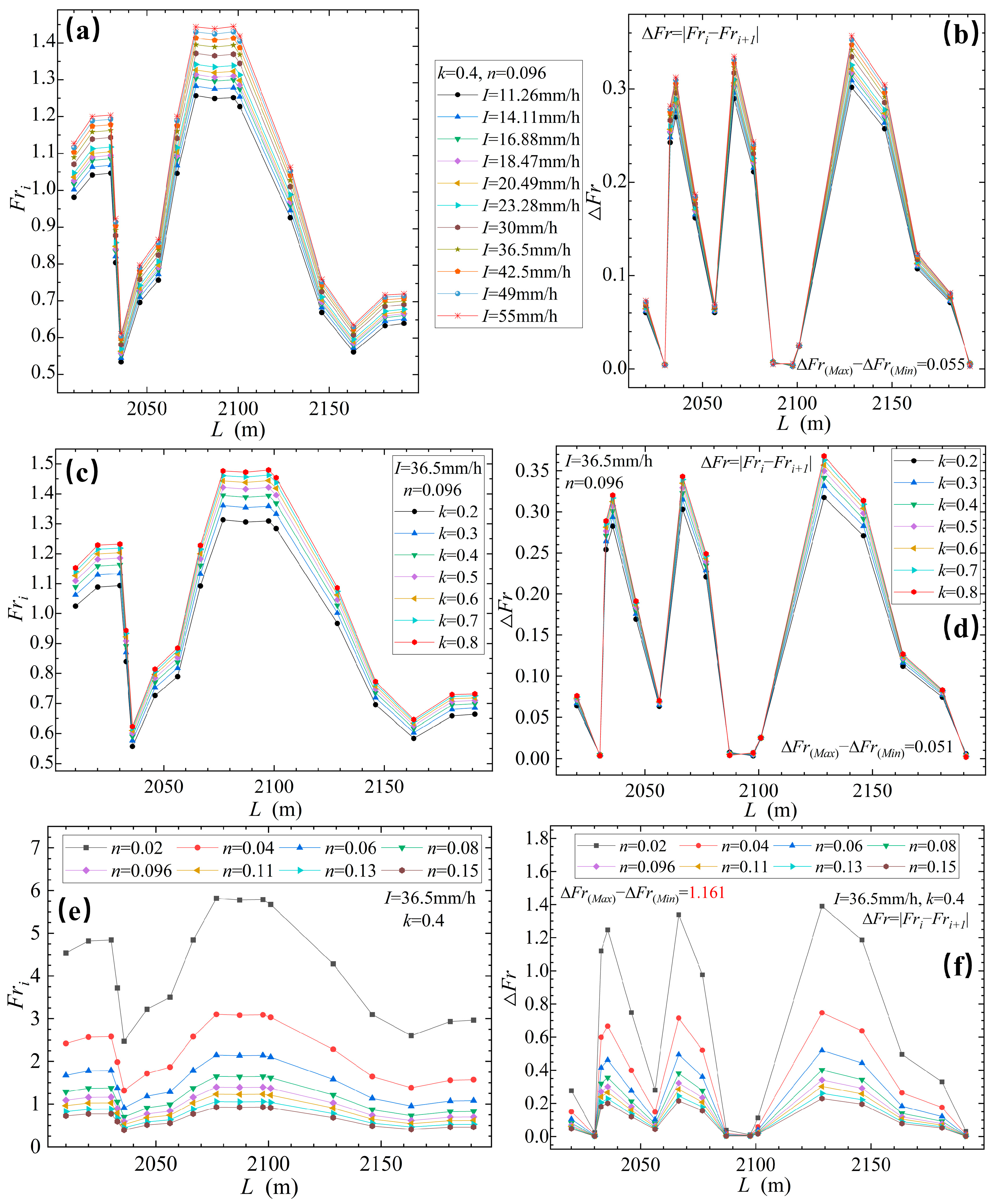 - Increasing markedly elevates (Figure 11a), whereas shows very weak sensitivity to (Figure 11b). At the location with the strongest response ( = 2128 m), the difference between the minimum at = 11.26 and the maximum at = 55 mm/h is only 0.055. Where adjacent have similar geometry (e.g., at = 2030, 2057, 2087, 2098, 2102, and 2191 m), is essentially insensitive to .