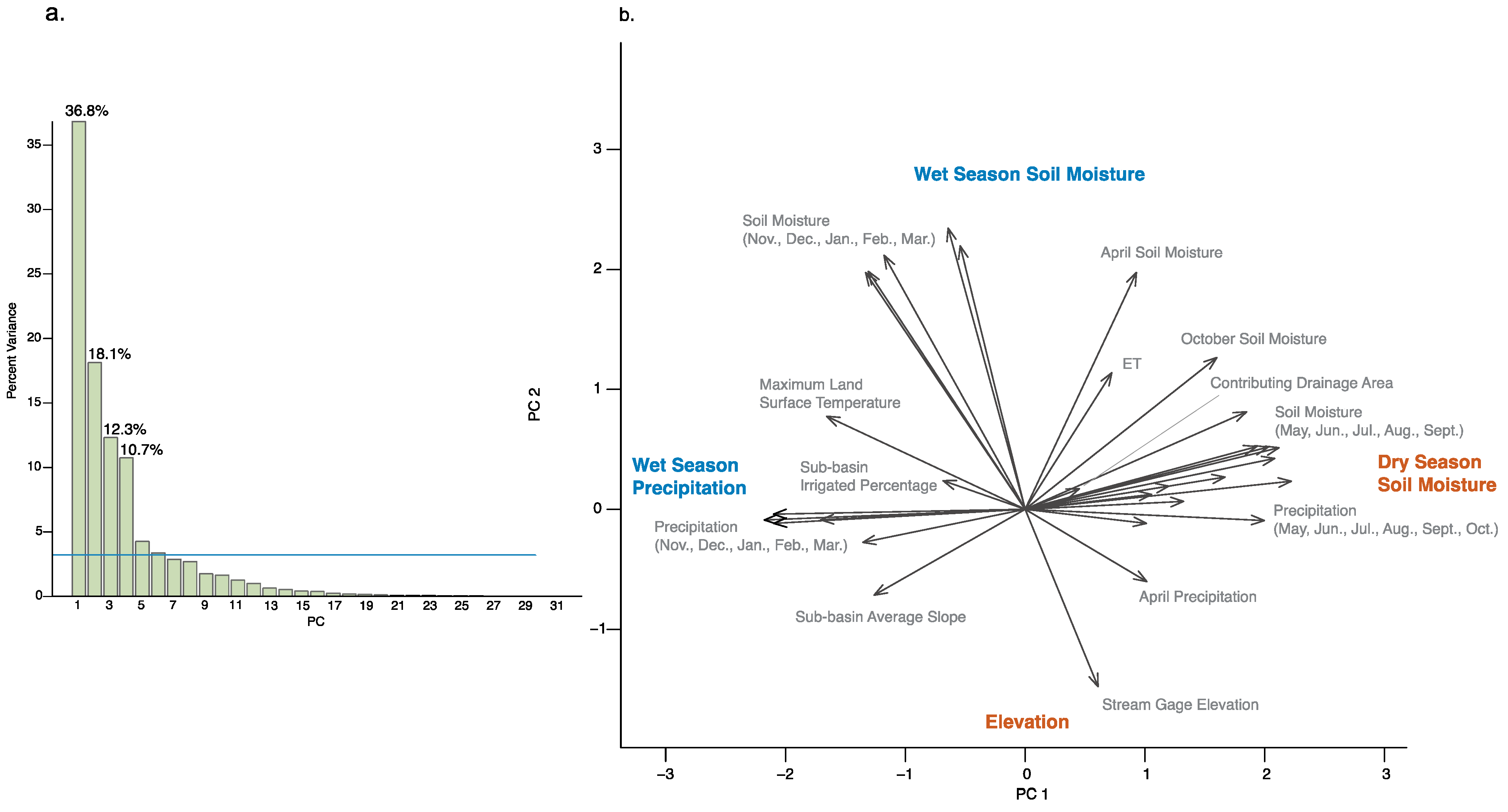 | Soil Hydrologic Group | U.S. Soil Hydrologic Group (SSURGO) water infiltration classification. Dominant soil hydrologic group (percentage of total area) within gage sub-basin (HUC 8) was extracted [53]. | 30 m |