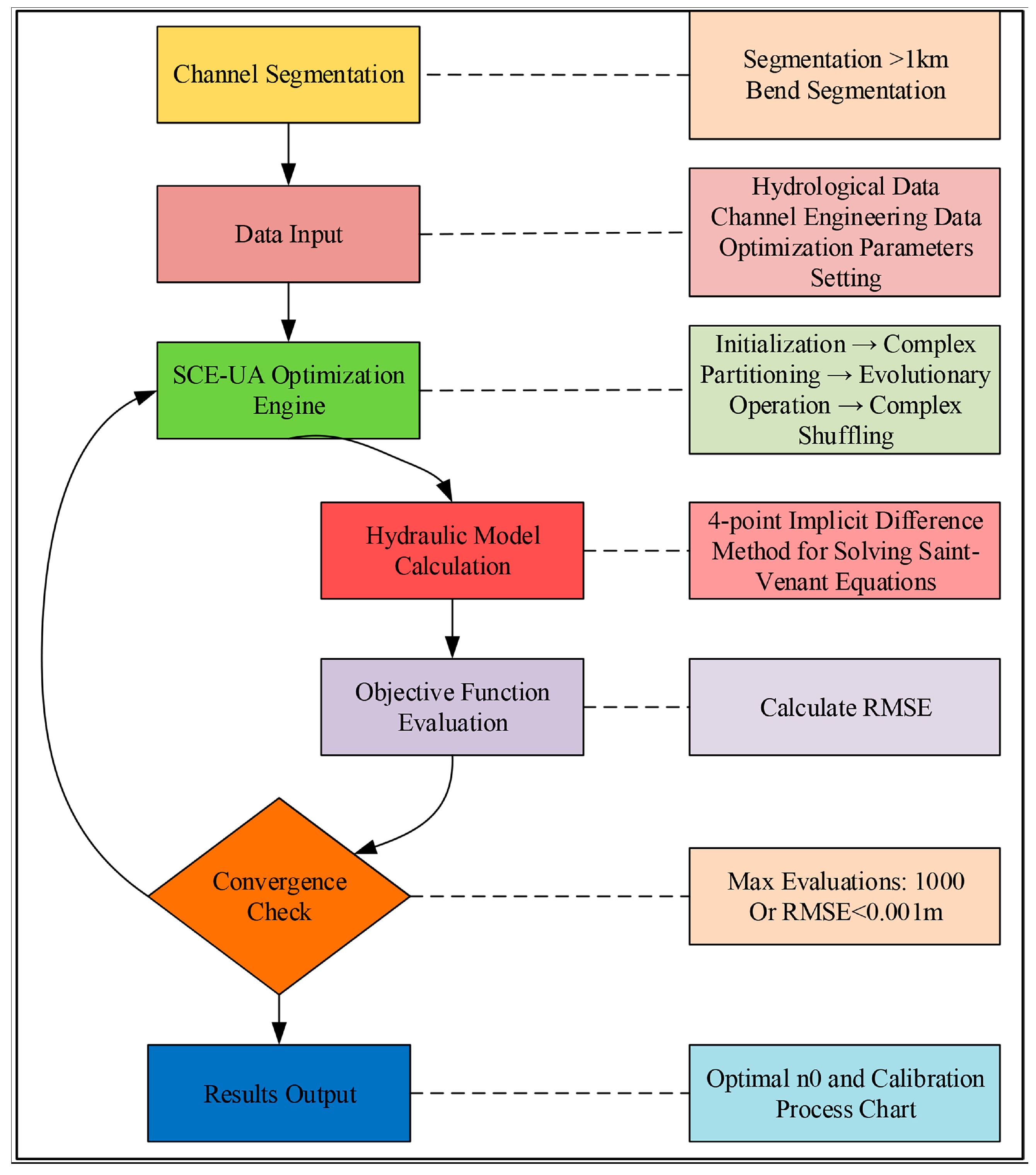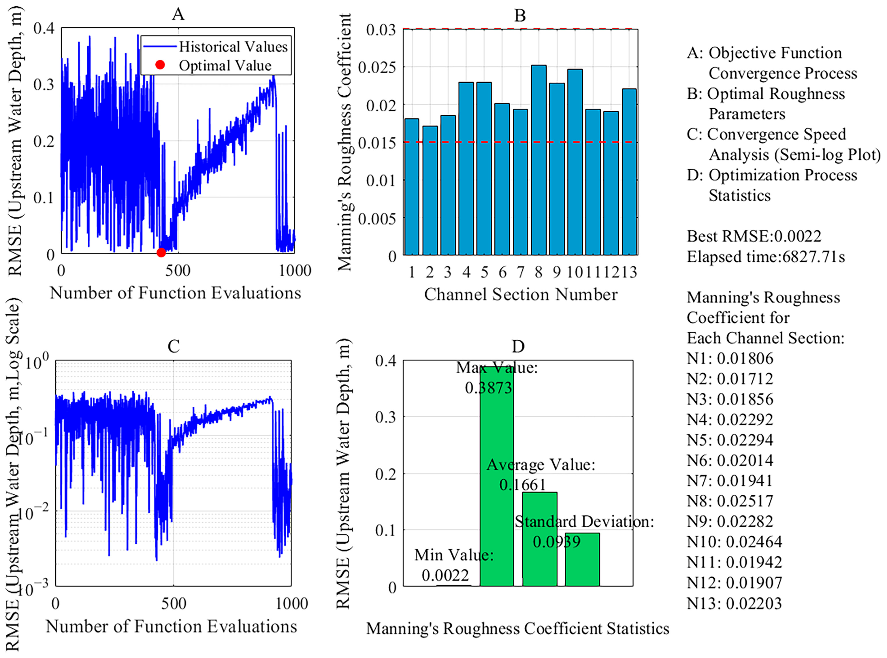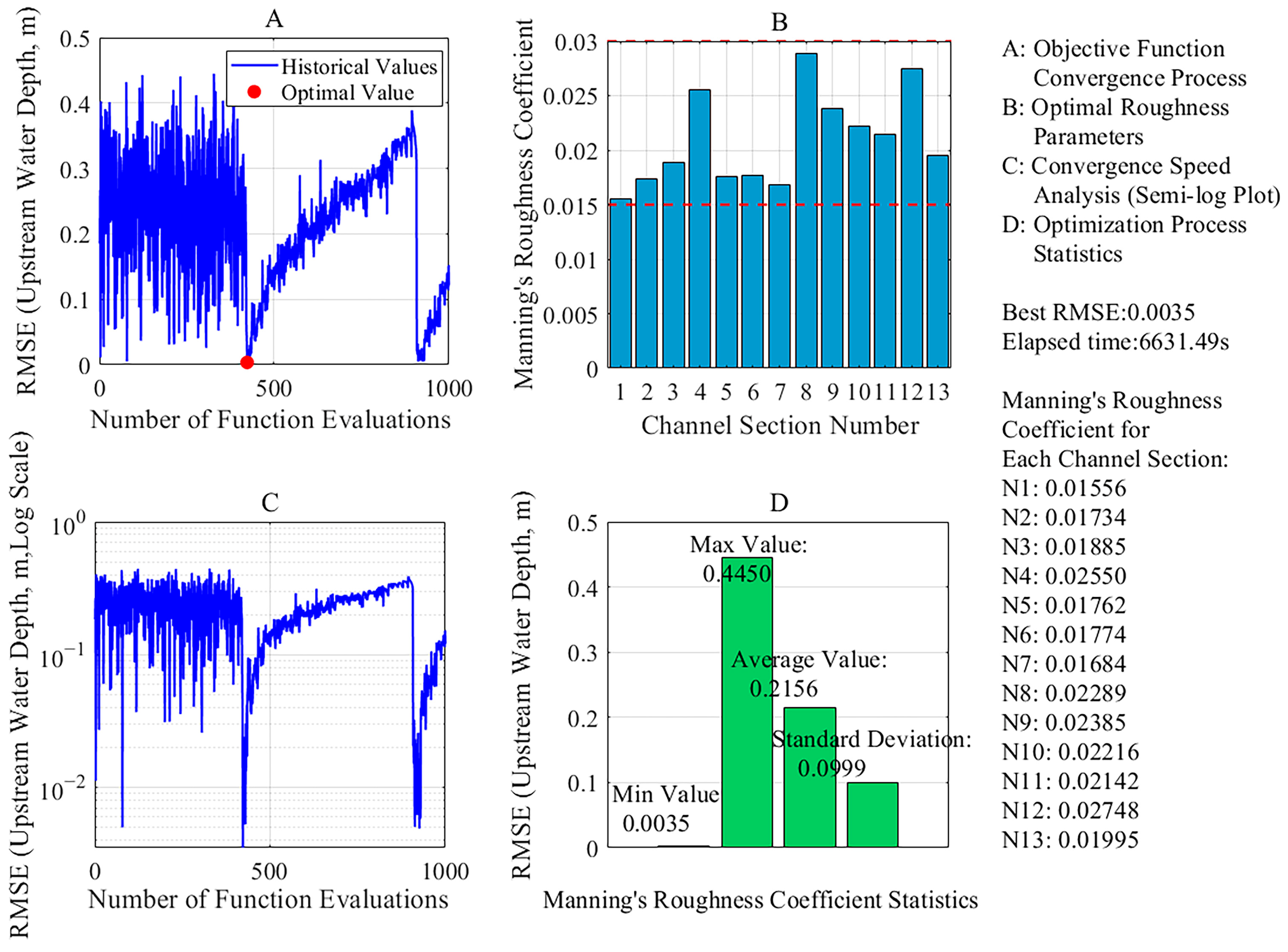 14]. A common approach involves minimizing the error between measured and simulated water levels as the objective function, treating Manning’s roughness coefficient as the decision variable, and solving for its optimal value using optimization algorithms [