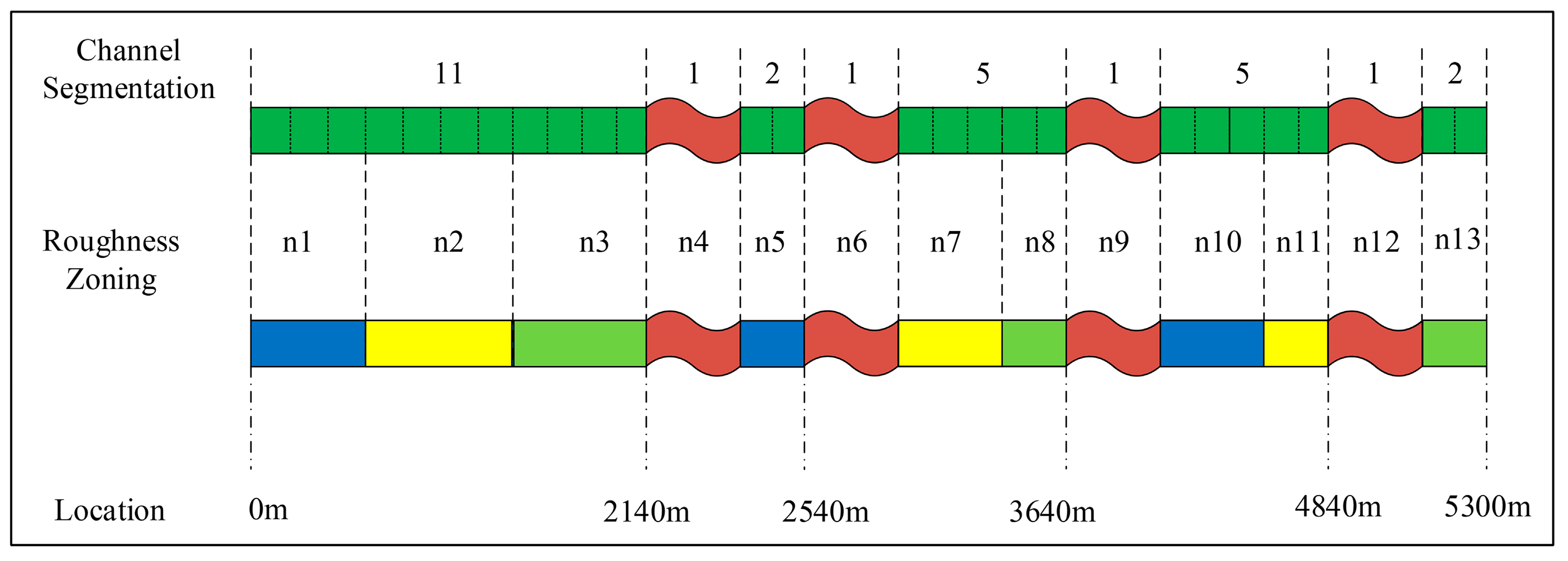 Figure 3, where the 5300 m channel is divided into 29 segments, with 13 Manning’s roughness coefficients to be calibrated.