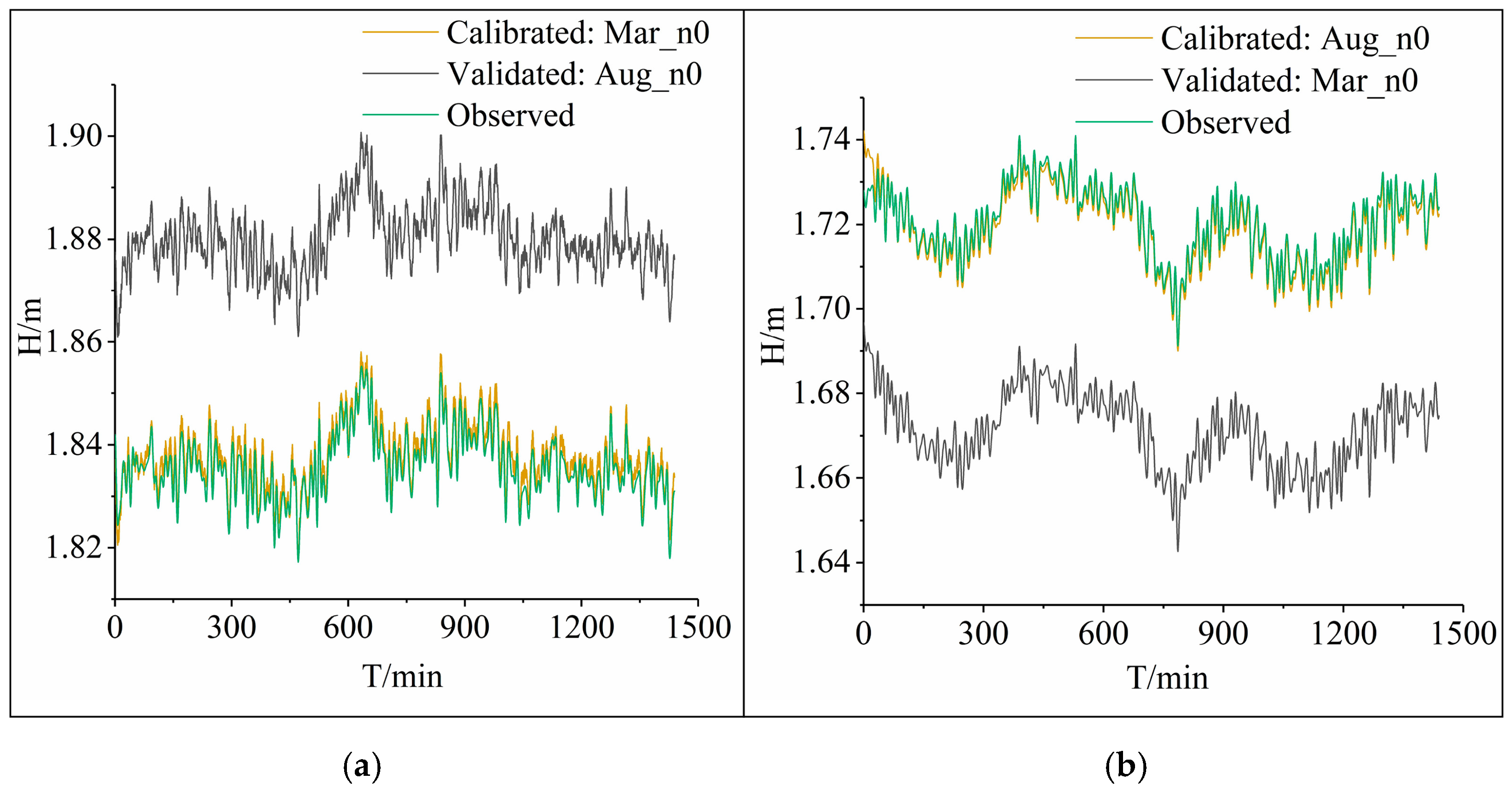 In contrast, cross-season validation results showed a significant deterioration in simulation performance. When Mar_n0 was applied to the August 2024 dataset, RMSE increased to 0.0491 m (nearly 14 times higher than within-season values), MAPE reached 2.7384 (exceeding the preset limit by over 5 times), and NSE plummeted to −31.94. Similarly, Aug_n0 used for simulating the March 2025 dataset yielded an RMSE of 0.0454 m, a MAPE of 2.3713, and an NSE of −51.16. The negative NSE values (below −30) further indicate that cross-season simulation performance deteriorated significantly, as the model’s accuracy was lower than that of a baseline model using the mean value for prediction.