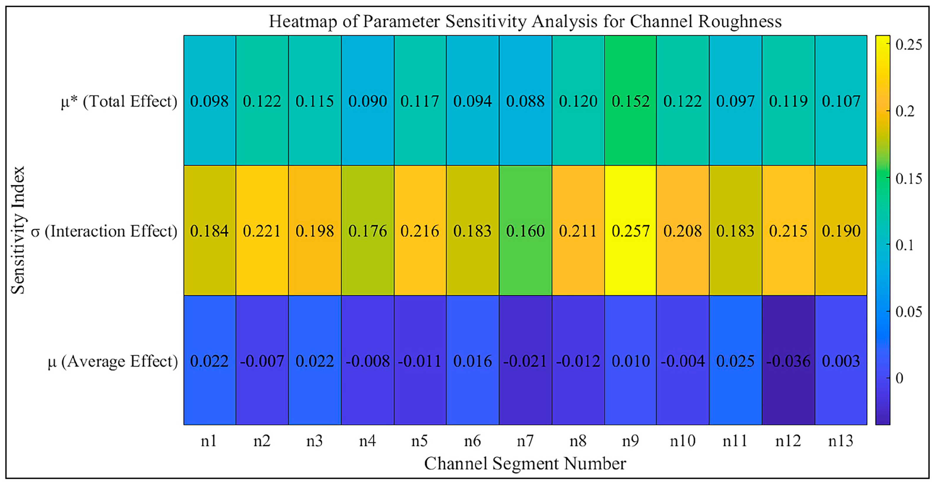 This study employs a segmented discretization approach to characterize Manning’s roughness coefficients of channels through regionalization. It constructs a multidimensional parameter system to accurately describe the comprehensive impact of their spatial variability on the flow propagation process. Based on the deconstruction principles of mathematical models in global sensitivity analysis, the response mechanisms of model outputs under the coupled effects of multiple parameters can be systematically analyzed. This enables the effective identification of core sensitive parameter clusters [