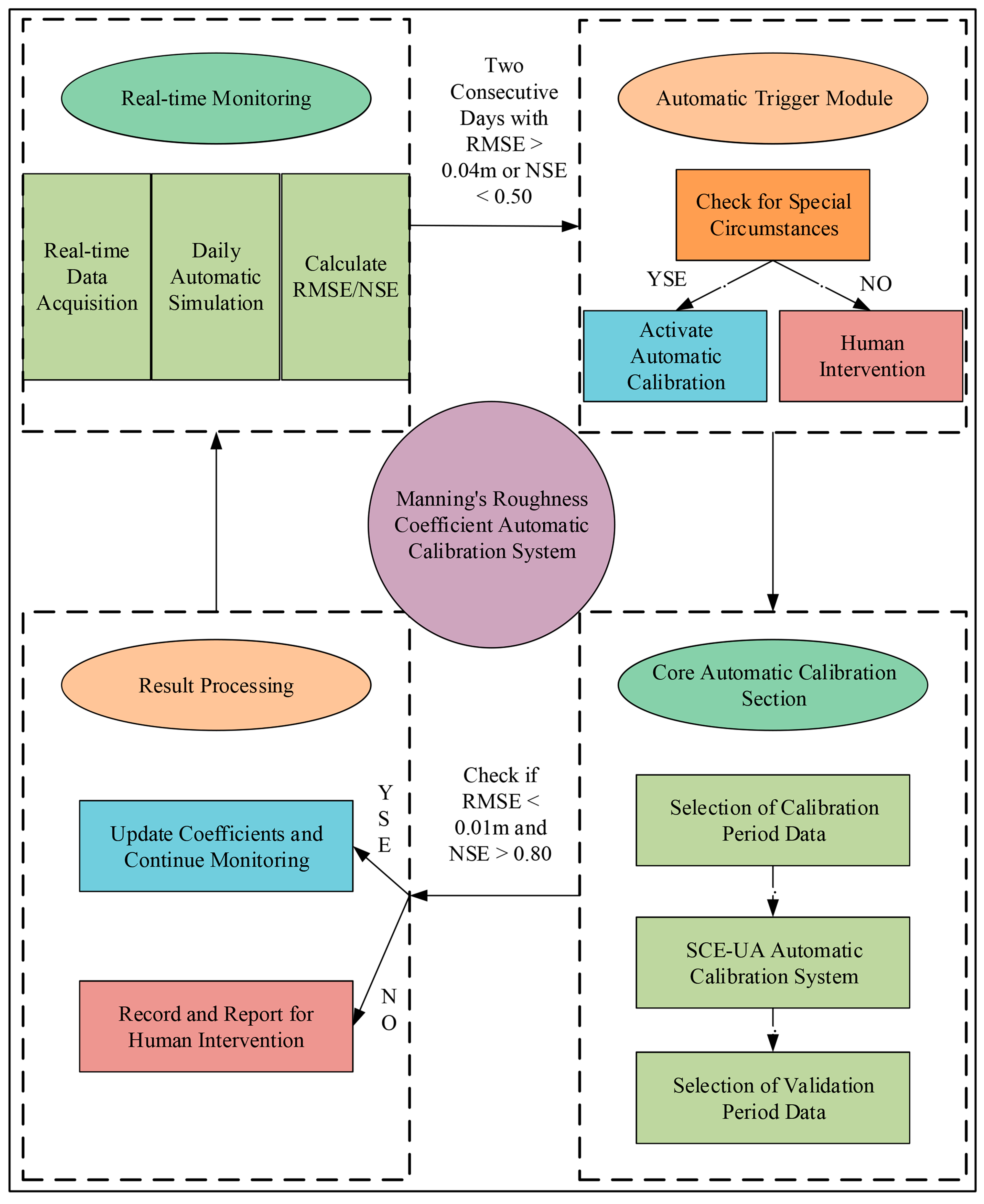 Building upon the SCE-UA-based calibration of channel Manning’s roughness coefficient described in the previous section, an automatic calibration system for Manning’s roughness coefficient has been established. The workflow of the system is illustrated in