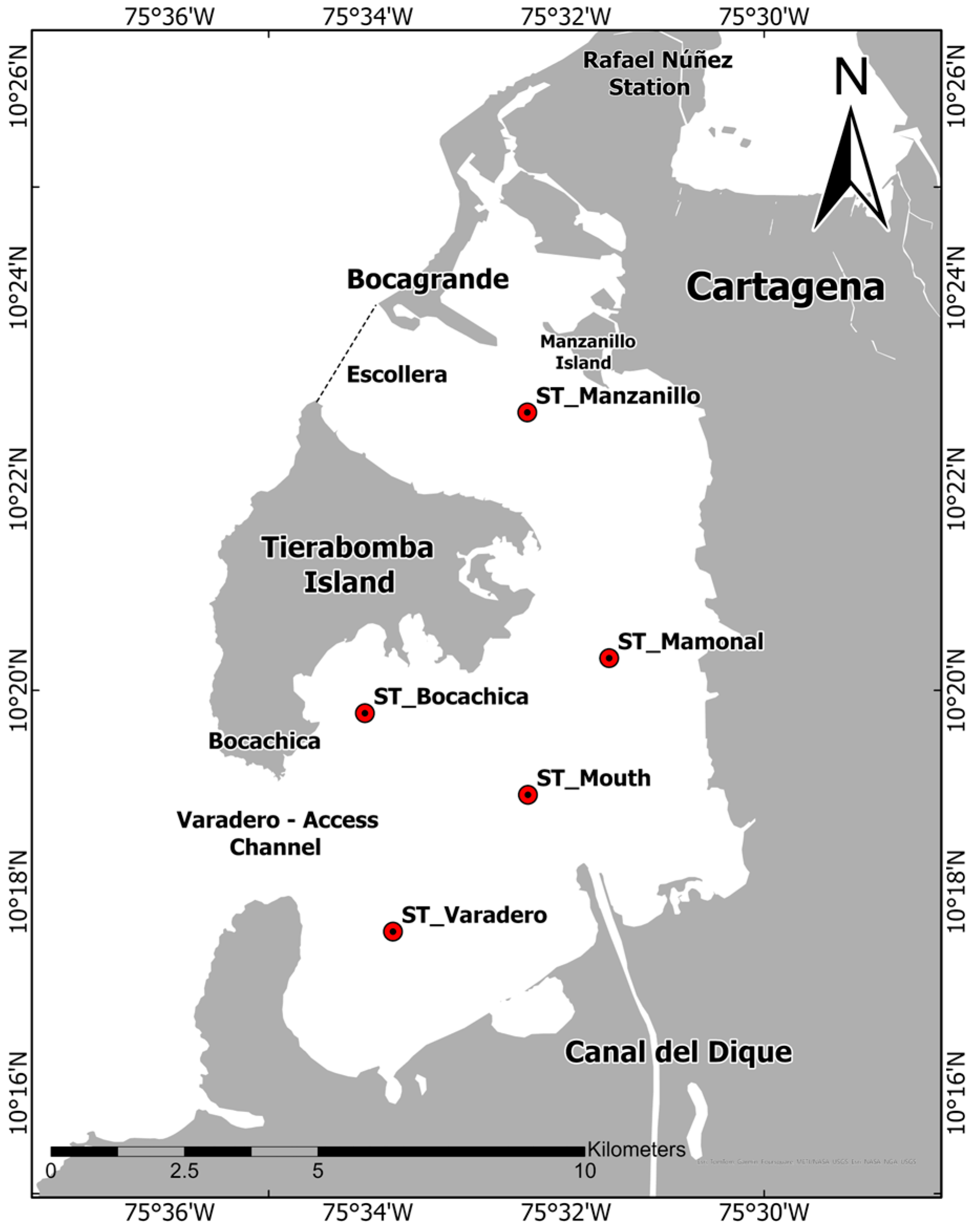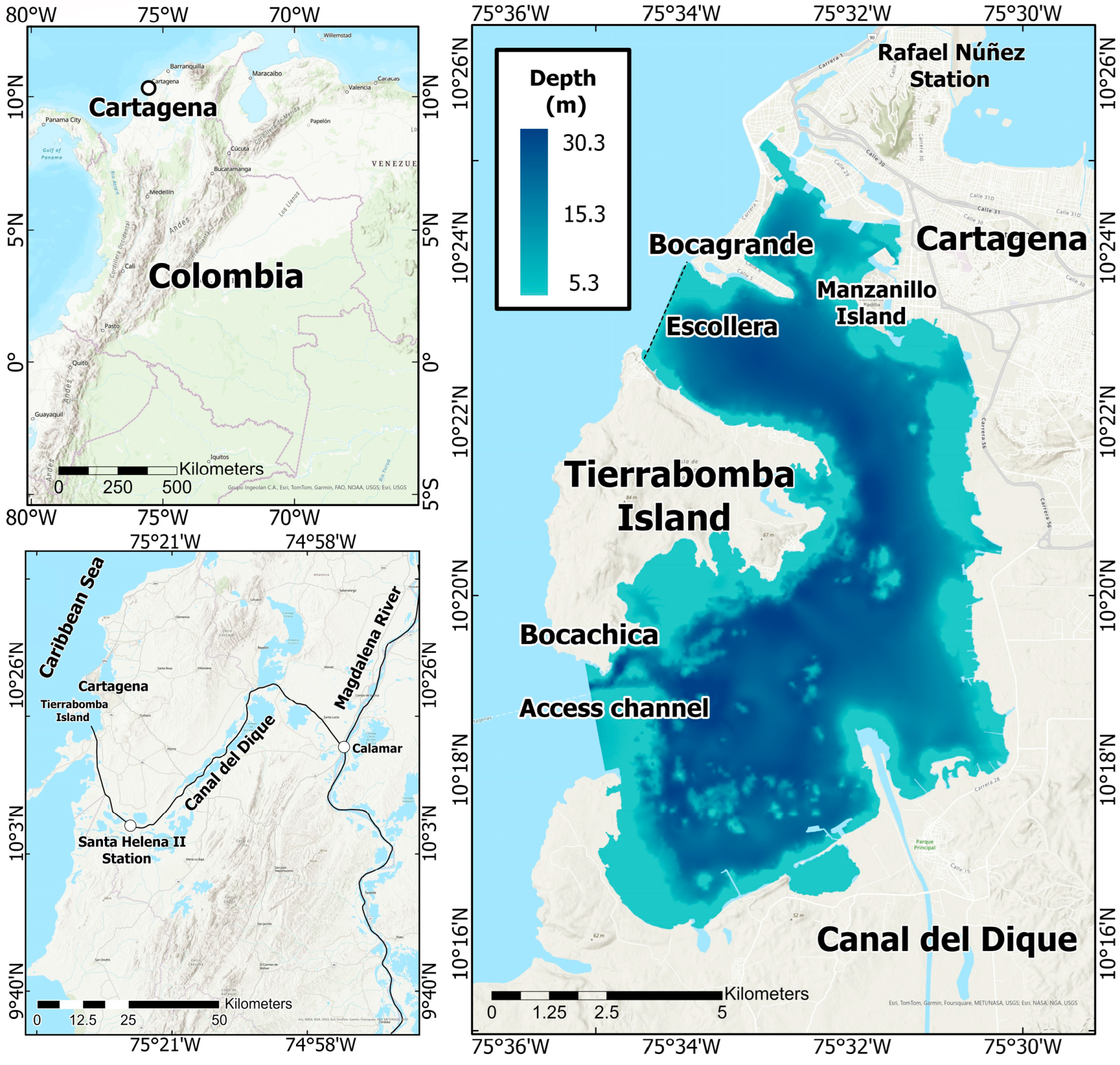 - Molares, R.; Mestres, M. Efectos de la descarga estacional del Canal del Dique en el mecanismo de intercambio de aguas de una bahía semicerrada y micromareal: Bahía de Cartagena, Colombia. Boletín Científico CIOH 2012, 45, 53–74. [Google Scholar] [CrossRef]