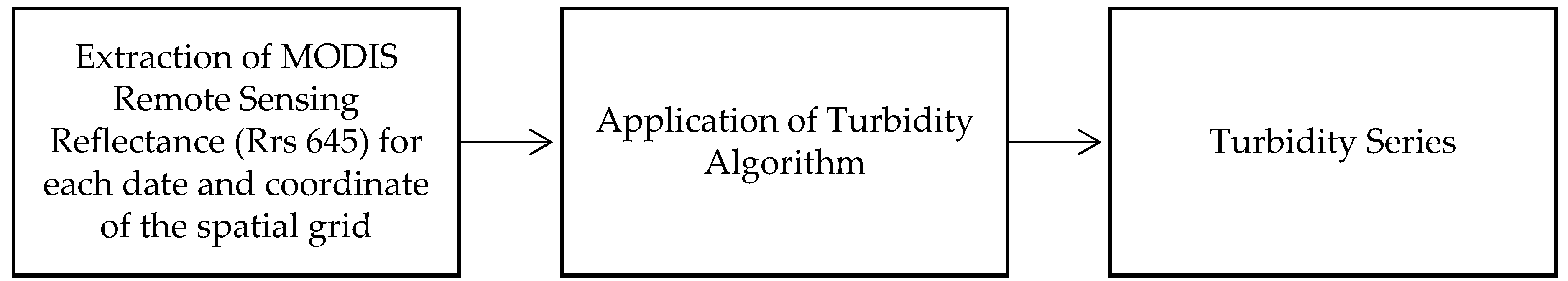 - Yang, G.; Wang, X.H.; Ritchie, E.A.; Qiao, L.; Li, G.; Cheng, Z. Using 250-M Surface Reflectance MODIS Aqua/Terra Product to Estimate Turbidity in a Macro-Tidal. Remote Sens. 2018, 10, 997. [Google Scholar] [CrossRef]